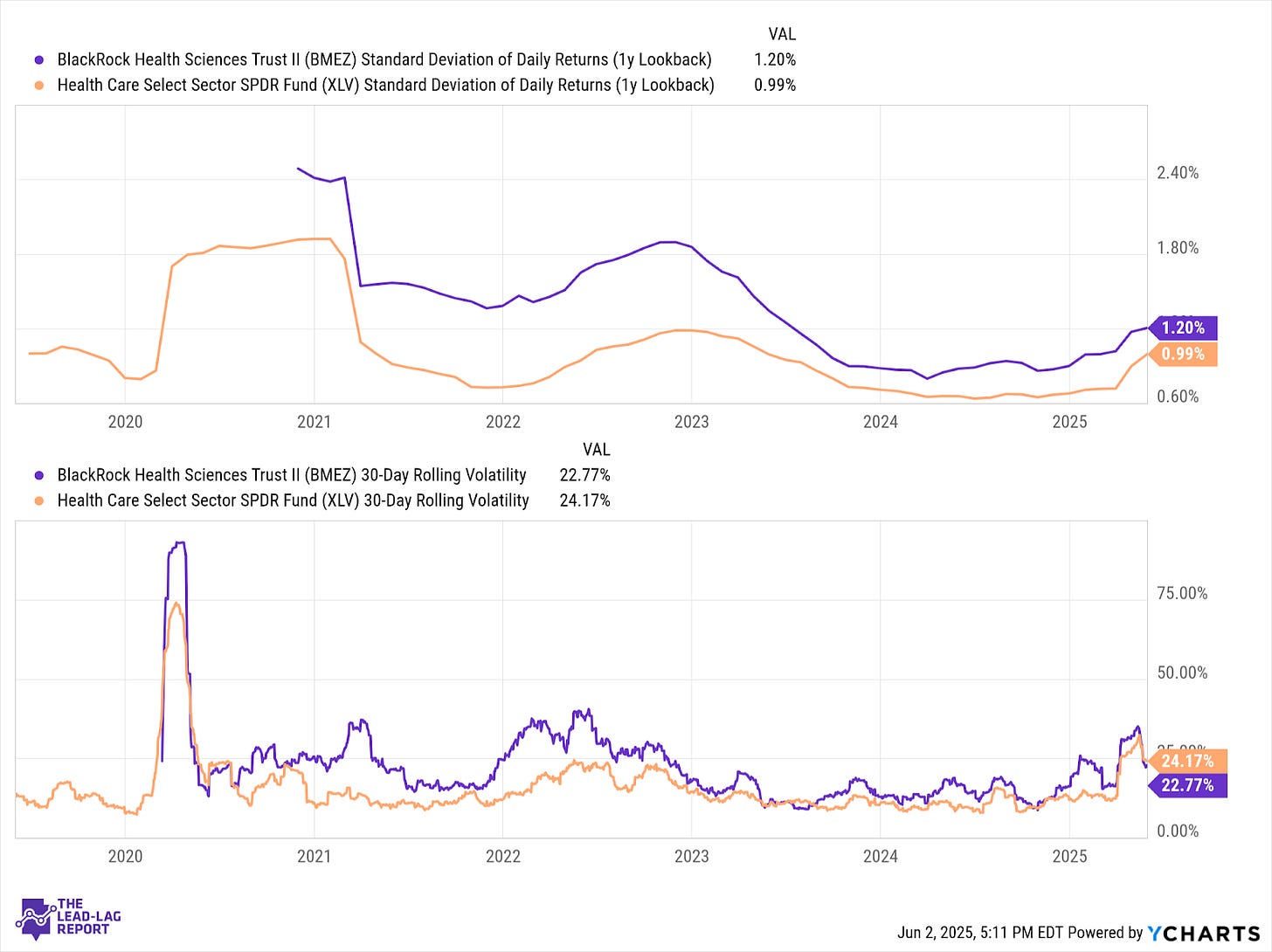 BMEZ’s modest covered call strategy is somewhat more volatile than the broader healthcare sector, but not by much. The written call overlay helps to moderate some risk, but the heavier tilt to biotechs, more speculative and smaller companies serves to ratchet it back up. Overall, there’s a reasonable level of risk for what you’re buying and the lack of leverage is probably a good idea for this space.