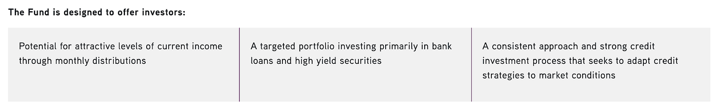 KKR’s primary investment objective is to seek a high level of current income with a secondary objective of capital appreciation. It seeks to allocate across credit instruments to capitalize on changes in relative value among corporate credit investments and manage against macroeconomic risks. The fund also uses leverage in order to enhance yield and total return potential.