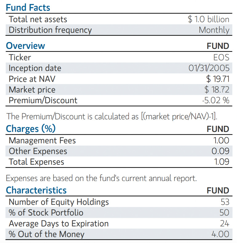 EOS’s primary investment objective is to provide current income, with a secondary objective of capital appreciation. It invests in a portfolio of primarily large- and mid-cap securities that the investment adviser believes have above-average growth and financial strength and writes call options on individual securities to generate current earnings from the option premium.