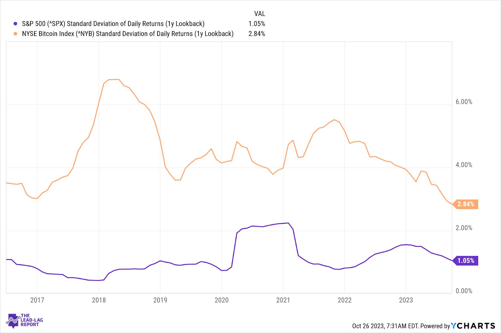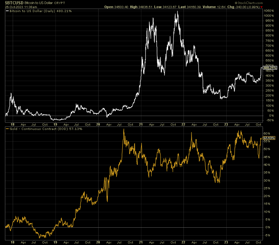 For the most part, we’ve seen bitcoin act more like a growth stock over the past several years under more normal market conditions. The rally we’ve seen in October, however, looks like something different. There’s a fair amount of noise around the potential approval of a bitcoin ETF by the SEC right now, but when considered in conjunction with other asset classes, I think we’re seeing a structural hedge taking place.