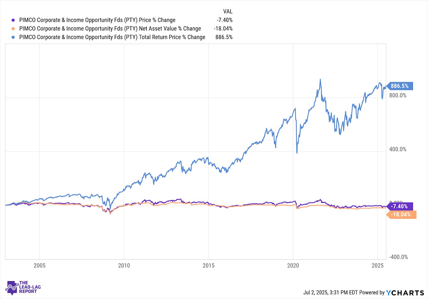 Since its inception in December 2002, PTY has generated a total return of 886%. That translates to an average annual return of around 12-13%.