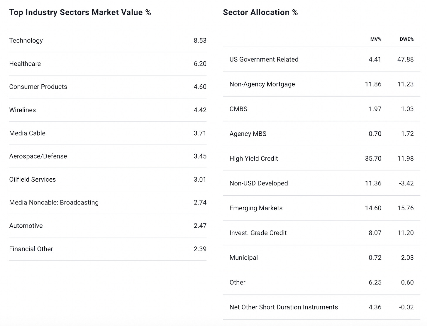 A plurality of the fund’s assets are in high yield credit, but the portfolio is fairly diversified beyond that. The double digit allocation to developed & emerging market credit and non-agency mortgage bonds reflects a definite tilt towards corporate bonds but a relatively solid mix beyond that. There’s an overall 60/40 split between junk and investment-grade securities, which gives it a nice diversification across credits, regions and sectors while delivering a higher yield.