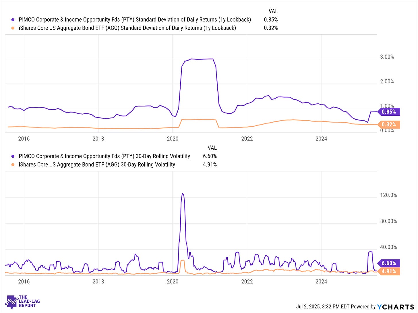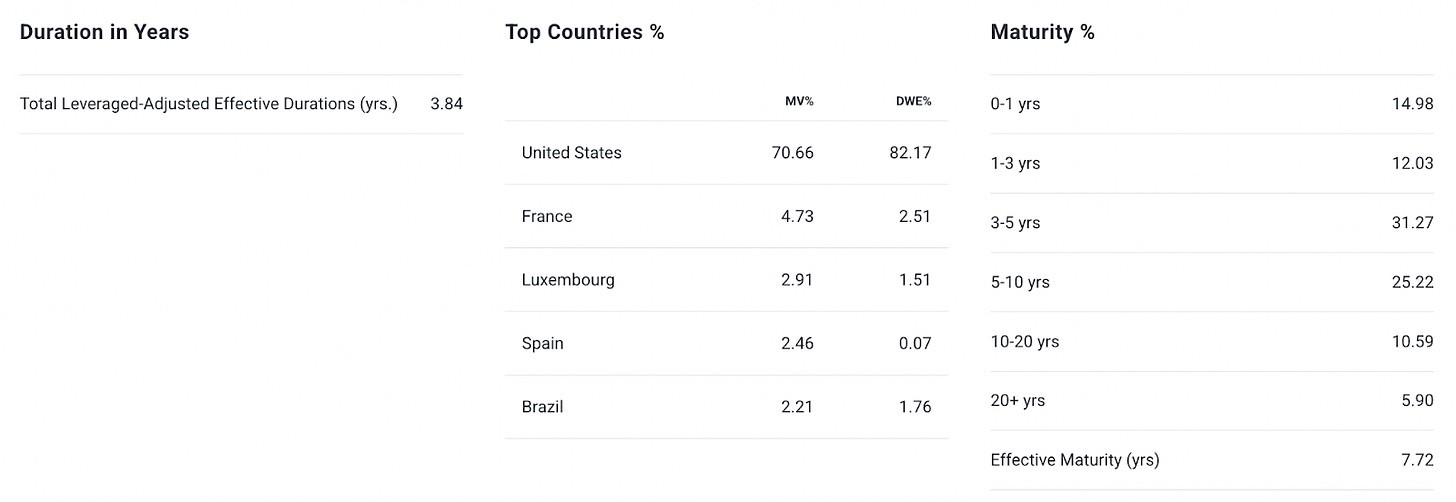 PTY maintains a minor global diversification, which is pretty consistent with a lot of other fixed income CEFs. The 4-year duration of the portfolio reduces a modest amount of duration risk, especially given that it’s leverage-adjusted, which may be a good thing given that yields have turned more volatile in light of competing macro forces. If yields follow the Fed lower, there’s obviously some appreciation potential that could be missed out on.