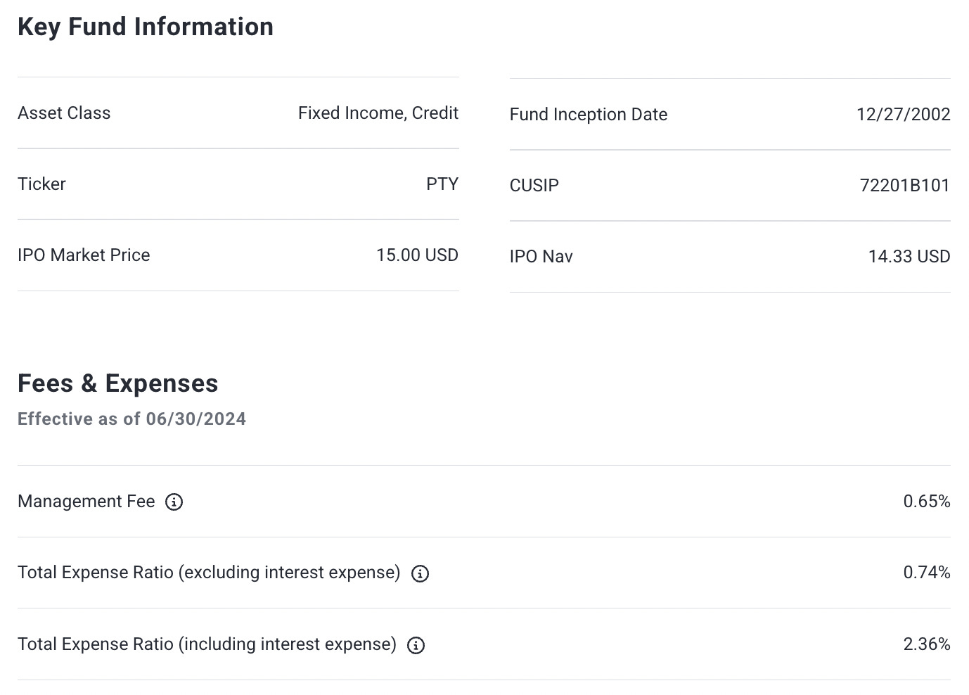 PTY uses a dynamic asset allocation strategy that focuses on duration management, credit quality analysis, risk management techniques and broad diversification among issuers, industries and sectors. The fund seeks maximum total return through a combination of current income and capital appreciation.