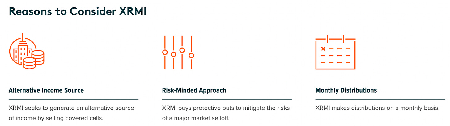 The valuation ratios aren’t as important as the risk stats here (although it’s worth noting that the P/E of 18-19, while lower than most of the post-COVID market period, is still well above the historical average). XRMI’s beta of 0.34 demonstrates that it’s not just less volatile than the underlying index, it’s significantly so. The covered call will cap most, if not all, of the underlying index’s upside, but the protective put also puts a floor on the index’s downside. That significantly modified range of possible returns essentially allows for the profile of a vanilla traditional covered call strategy with a downside cap at some point.