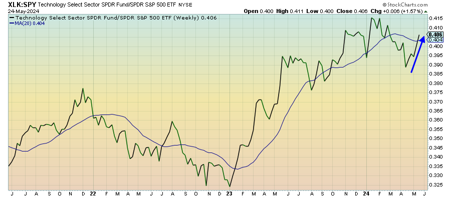 Utilities are taking a bit of a break here, but the uptrend looks like it’s still intact for now. As the market digests the reality that the Fed is unlikely to come to the rescue with rate cuts anytime soon, tech & growth have been getting some renewed run. However, with transports looking incredibly weak, long-dated Treasuries starting to make a comeback and volatility looking a bit more unstable, defense is still showing life.