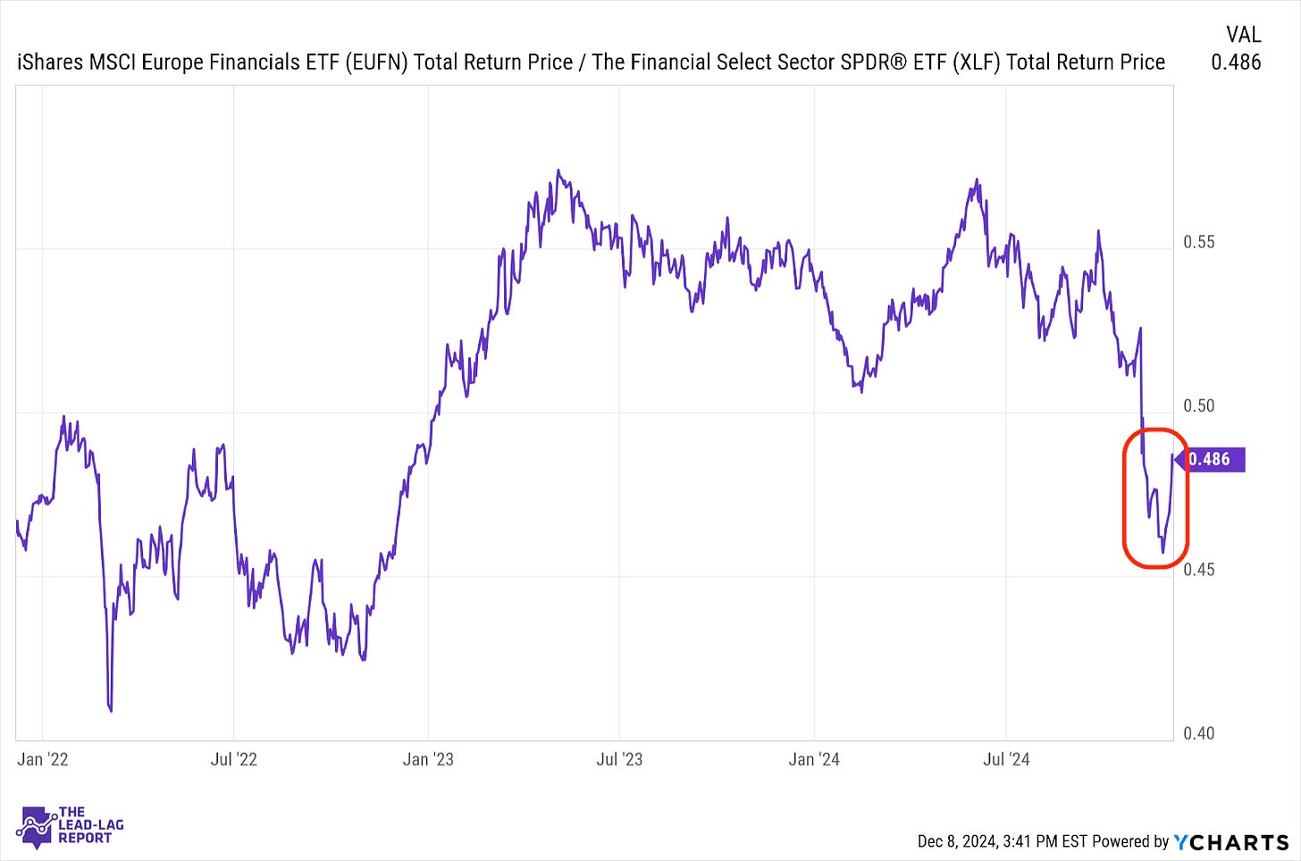 This ratio reflects the sharp underperformance of U.S. financials last week more than a rally in Euro banks. Given the potential for a deregulatory tailwind, I feel comfortable saying that the longer-term trend in this ratio is probably down. The European economy is in a really rough spot right now trying to avoid recession and it’s cyclical sectors like this one that usually get hit hardest in that kind of environment.