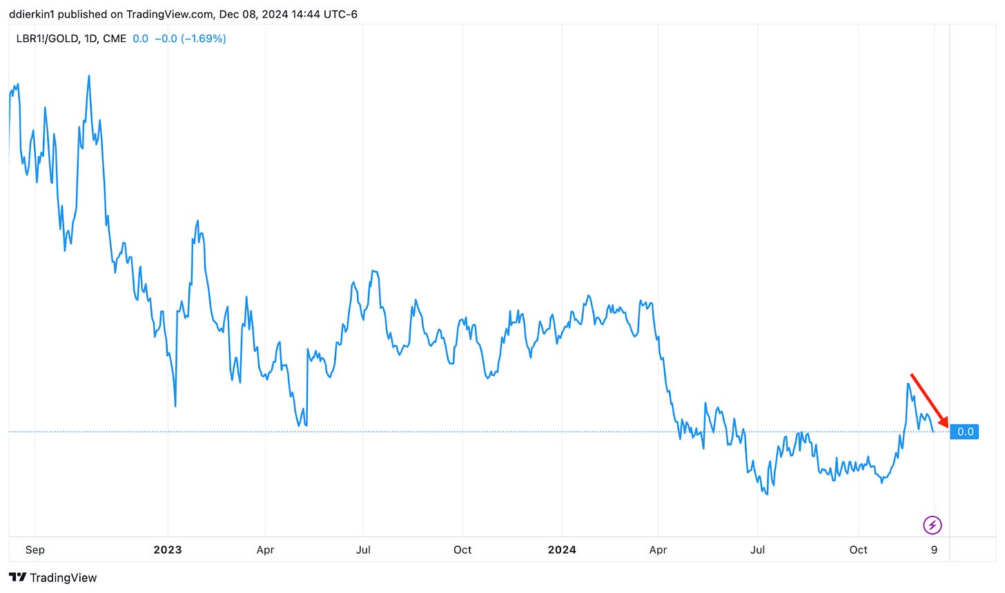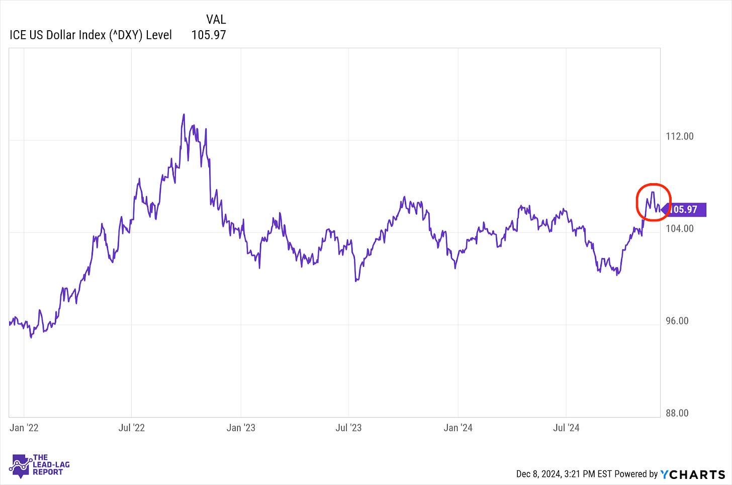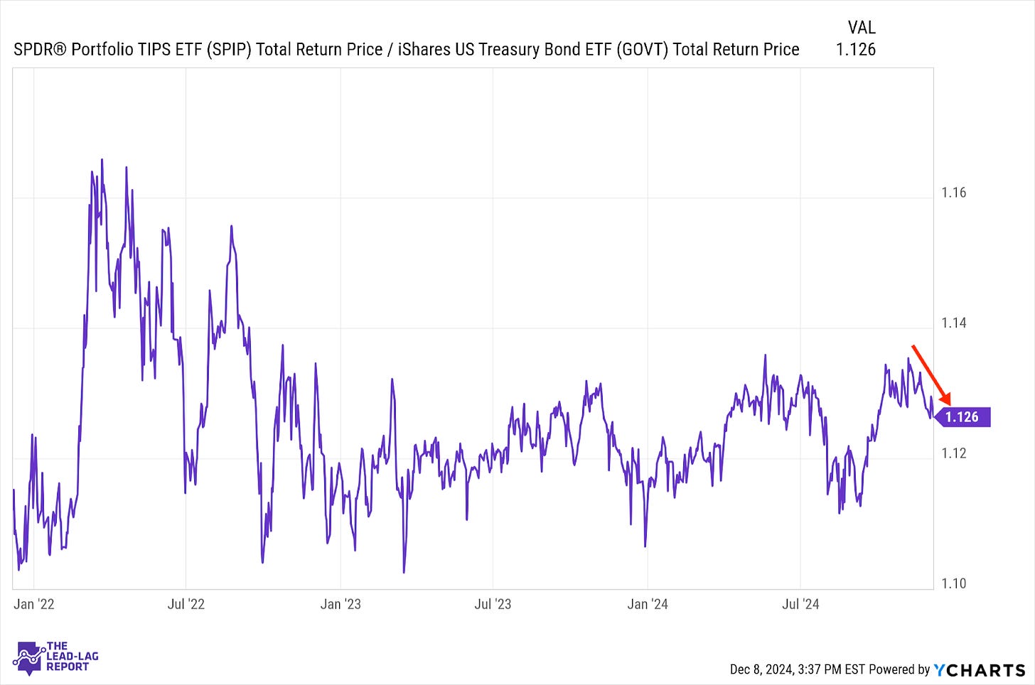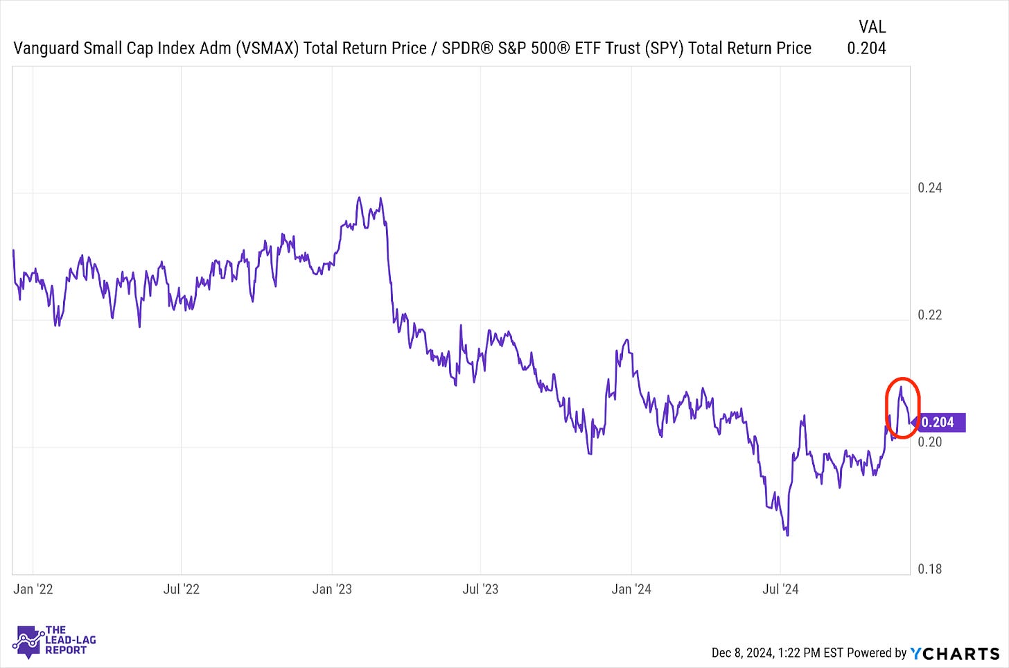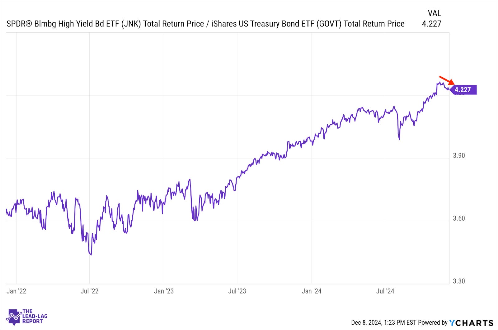 Utilities continue to fade here, easing up on one of the stronger signals that had been indicating caution. It had been outperforming the market for months even though other defensive counterparts had been consistently lagging. Now, the pro-business outlook during the second Trump presidency seems to be winning out. If the BoJ hikes next week and ushers in the December surprise, don’t be surprised to see this ratio shoot higher again.
