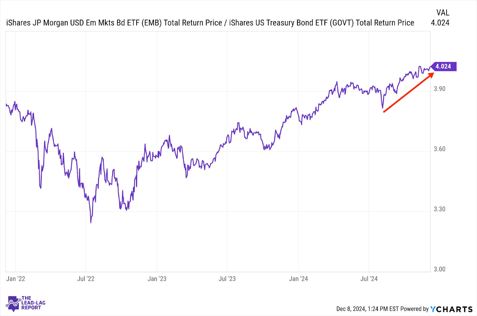 Emerging markets debt has used the recent dip in the dollar to continue its steady outperformance trend even as U.S. junk bonds have turned the other way. This category is likely going to be considered more speculative as global conditions outside of the U.S. deteriorate, but many central banks are cutting rates and liquidity is likely to improve, thereby making conditions for EM debt favorable for a while longer.