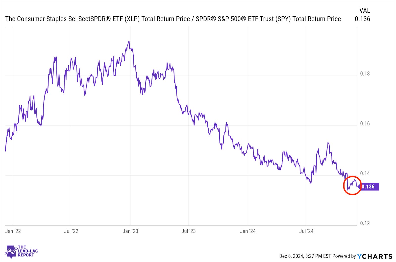 Discretionary stocks remain the undisputed U.S. equity market leader since the end of last summer. Even though the Fed is unlikely to cut as much as originally thought, long-term rates are easing, consumer spending has been resilient and post-election economic optimism has ruled the day. If the market continues its recent trend of finally rotating away from cyclicals and towards growth again, this rally could continue although it looks short-term overdone.