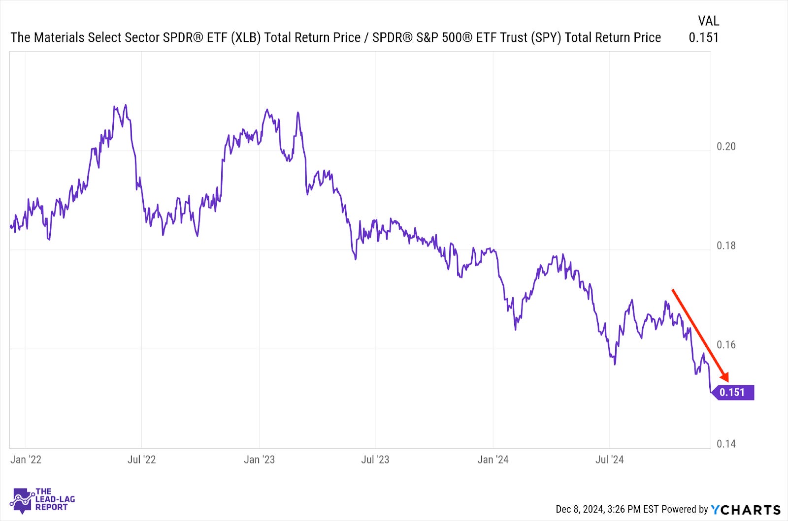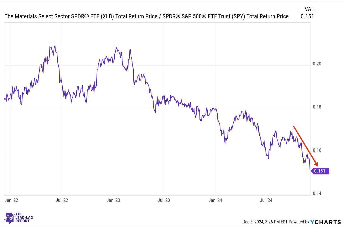 Materials stocks have spent the past two years setting a series of lower highs and lower lows relative to the S&P 500. This sector has consistently reflected the weakness in the global manufacturing sector and I don’t see that changing anytime soon. There are glimmers of hope in certain parts of the world, including China if their government stimulus package comes through, but it’s difficult to see a sharp reversal happening in the short-term here.