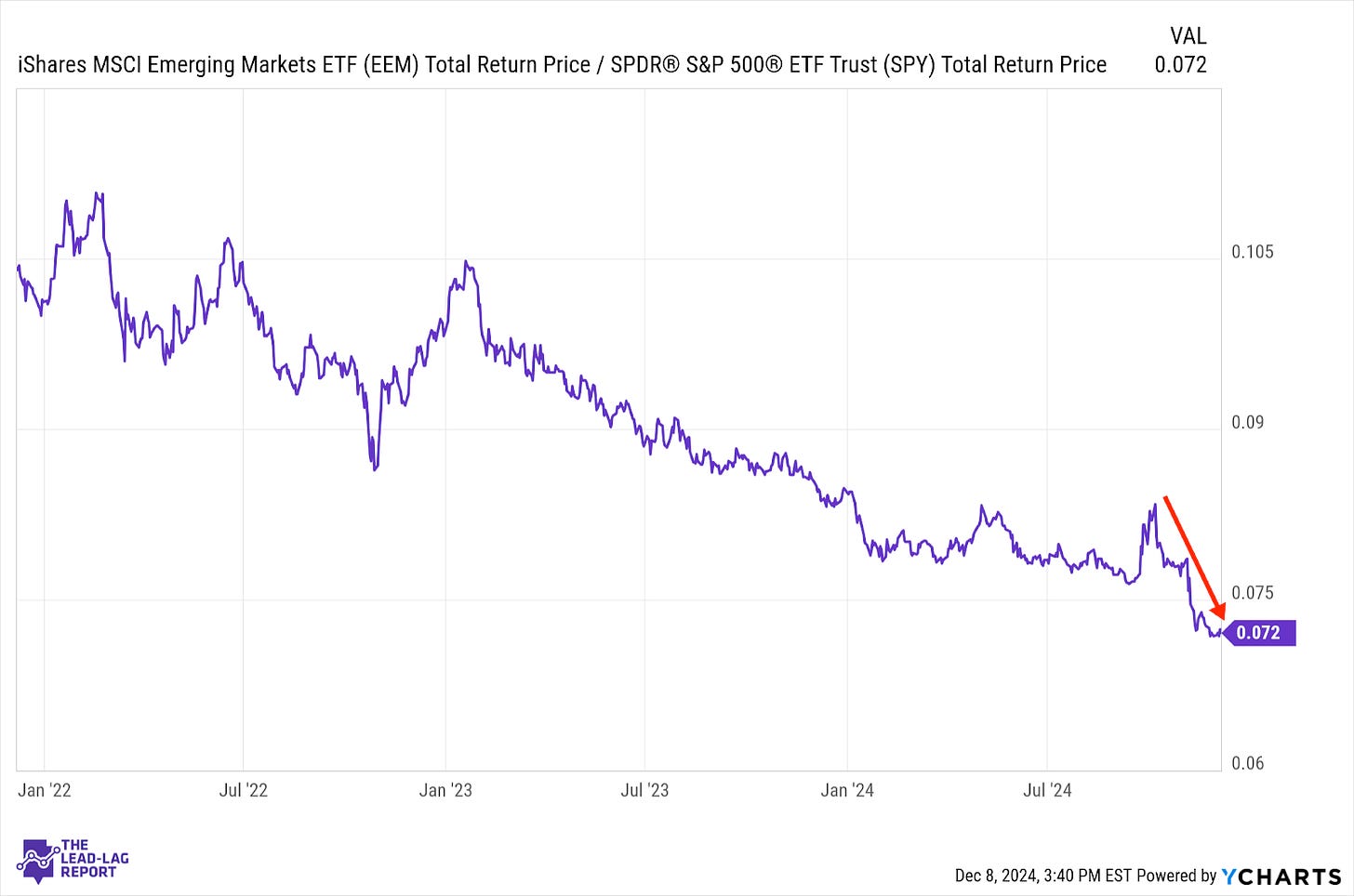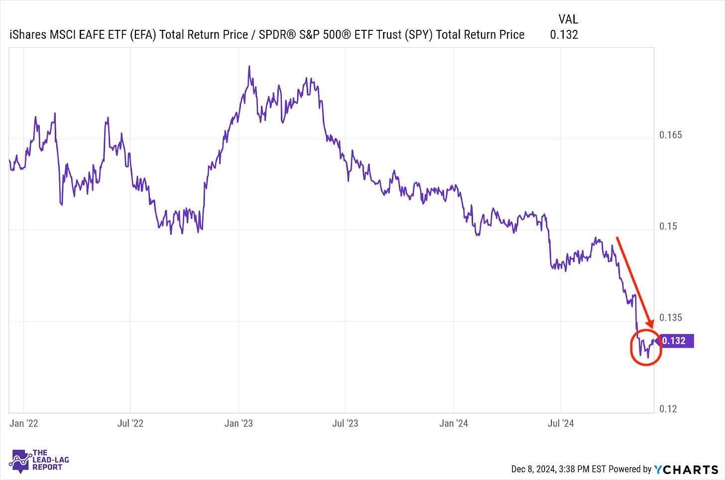 Another sign that the post-election stock market rally could be fizzling is the fact that developed market equities could be bottoming out here relative to the S&P 500. There hasn’t been a lot of great news coming out of Asia or Europe, although central bank rate cuts over the next two weeks could help. Based on economic activity alone, it seems unlikely that international stocks are ready to stage a big comeback right now.