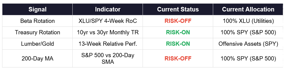 Target Investor: Self-directed investors who want to capture relative strength between equity market segments. This signal uses the 4-week rate of change of the Utilities-to-S&P 500 price ratio to determine whether the market favors offense (broad equity) or defense (Utilities).