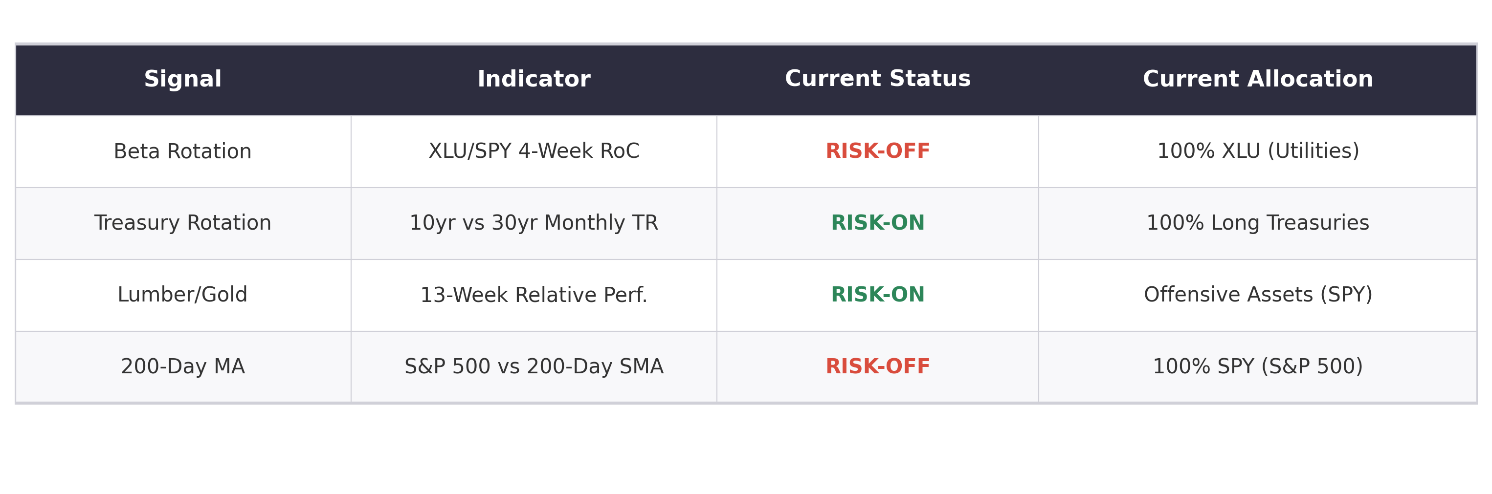 The Lumber/Gold signal remains Risk-On with lumber’s 13-week return at +11.82% versus gold’s +5.24%. Unlike prior weeks when this reading was dismissed as a forced-liquidation artifact, the signal is now carrying more genuine economic information. Lumber’s 12% gain reflects resilience in housing demand despite higher mortgage rates, while gold’s more modest 5% gain — while still positive — suggests the panic bid has subsided from the $5,000+ levels of early March. All seven Lumber/Gold sub-strategies remain in offensive positioning, and for the first time in several weeks, that positioning feels more aligned with underlying economic reality.