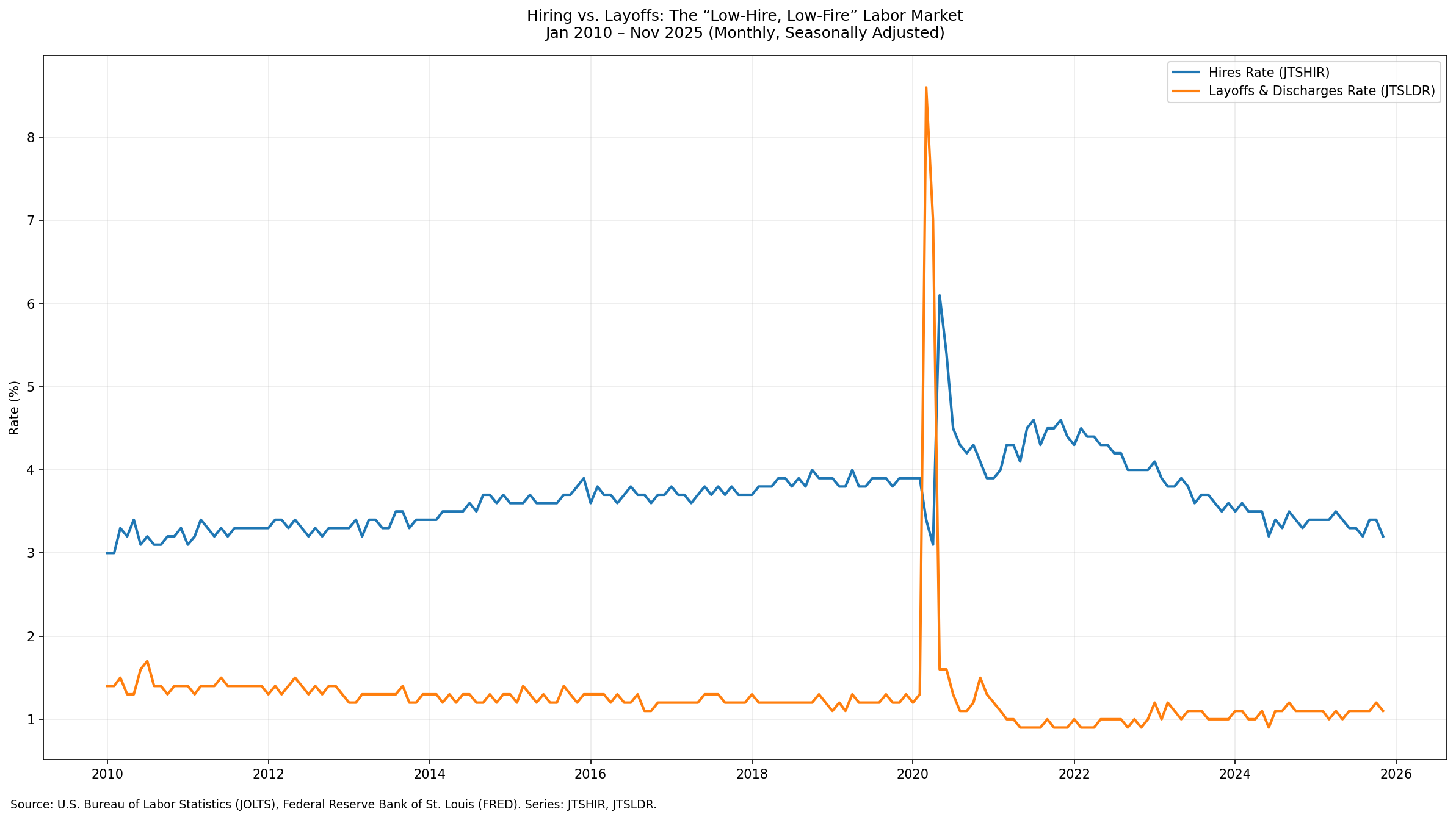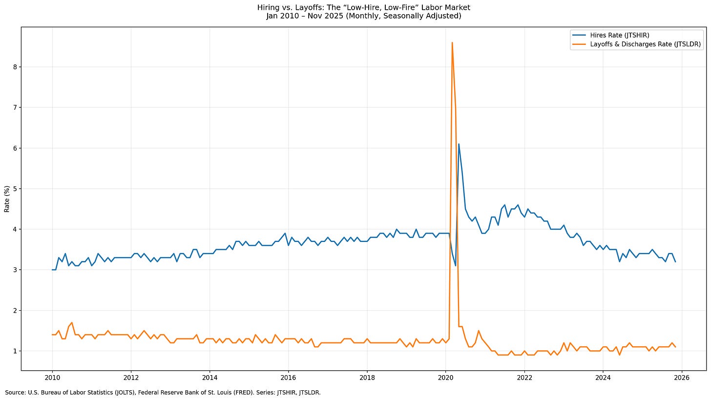 U.S. labor data point to a stall-speed economy, with hiring slowing sharply while layoffs remain limited.