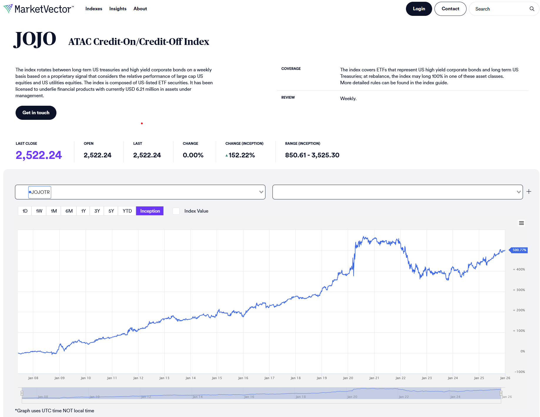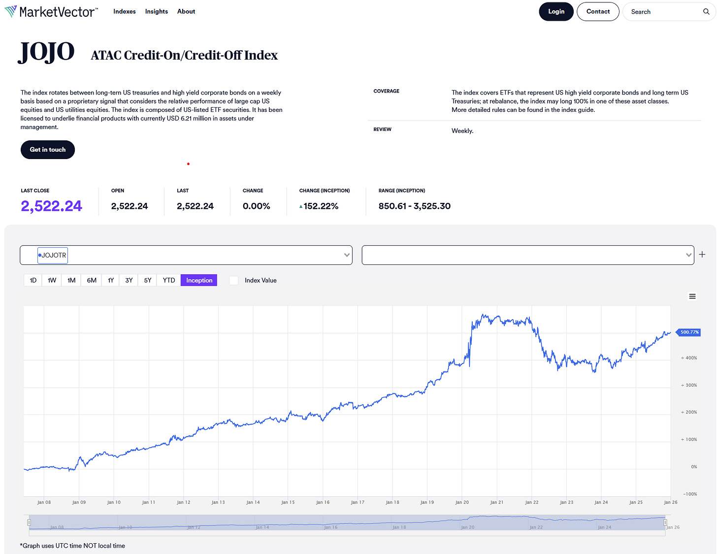 The JOJO.INDEX, formally known as the ATAC Credit-On/Credit-Off Index, is a rules-based allocation model designed to respond to changes in market risk appetite. It toggles between high-yield corporate bonds and long-duration Treasuries based on a single signal: the short-term relative performance of utility stocks versus the broader equity market. When utilities outperform, the index adopts a defensive posture. When they lag, it takes on credit risk.