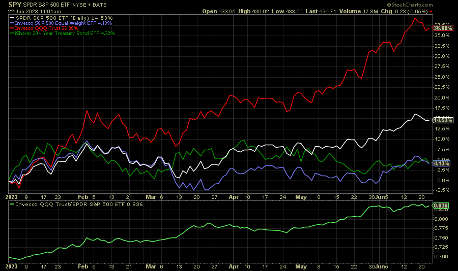 While the large-cap averages are ripping right now, it’s important to remember that the market isn’t the economy. Granted, GDP growth remains positive, the labor market is still surprisingly strong and the resilience of the U.S. economy has lasted longer than expected. The overall macro picture, however, still points towards a likely recession within the next 12 months. The housing market is still sluggish (despite a recent uptick in the data, which I don’t suspect will stick), manufacturing is struggling, China is struggling, credit is tightening, the Fed is winding down its balance sheet and the majority of the interest rate hikes already enacted by the Fed haven’t had time to really filter into the economy yet. In short, conditions are likely to get tighter and worse for both consumers and businesses and that’s before we even consider the fact that core inflation is sticky and persistent.