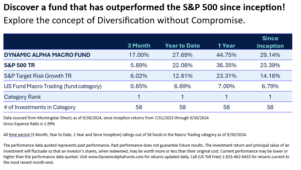 Important Risks: Investing in mutual funds involves risk, including loss of principal. Risks specific to the Dynamic Alpha Macro Fund are detailed in the prospectus and are linked here: https://dynamicalphafunds.com/performance-2/ . For a complete description of risks specific to the Fund, please refer to Fund’s prospectus.