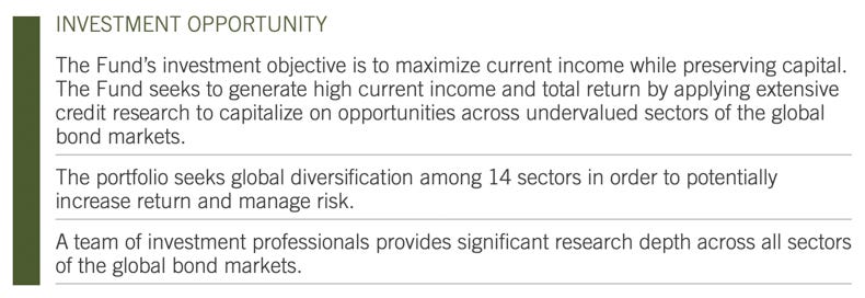 VGI’s investment objective is to maximize current income while preserving capital. The fund seeks to achieve its investment objective by applying extensive credit research to capitalize on opportunities across undervalued areas of the global bond markets. Newfleet Asset Management, which oversees the fund, claims expertise in every sector of the bond market, including evolving, specialized, and out-of-favor sectors. The team employs active sector rotation and disciplined risk management to portfolio construction. The fund also utilizes leverage in order to maximize yield and total return potential.
