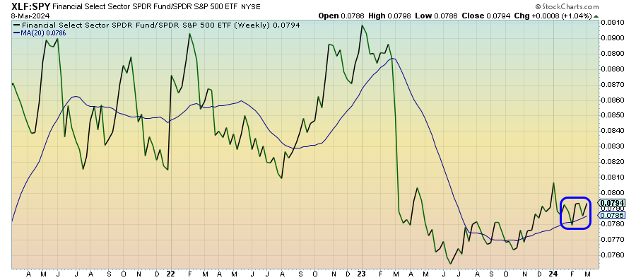 Financials aren’t having as much success as the rest of their cyclical counterparts at the moment, but they are hanging on. Some of that may have to do with the volatility and uncertainty around the direction of interest rates, but investors are also getting spooked by the negative financial impact of a CRE bust in the future. Developments in the real estate space may have as much influence as anything for banks moving forward.