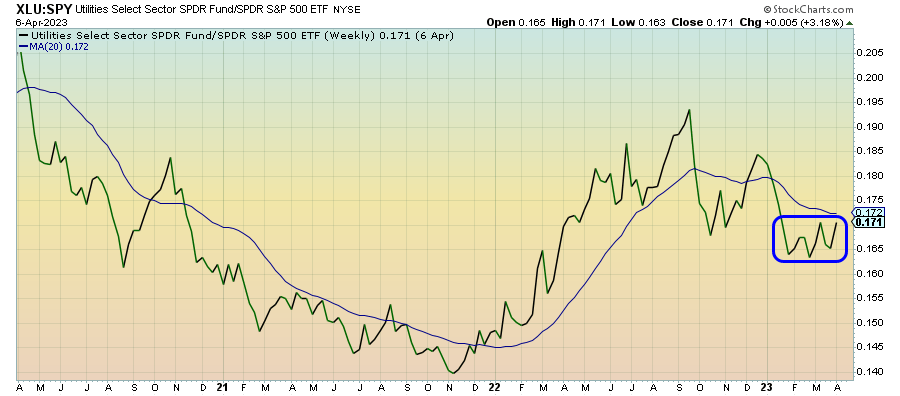 Consumer staples continue to trend higher, confirming the pattern we’re seeing across a number of traditionally defensive asset classes. The volatility we’ve seen in this ratio throughout 2022 and into 2023 is unusual based on history, but I don’t think it can be ruled out from happening again. With so many variables at play - banks, inflation, the Fed, recession, geopolitics - it wouldn’t be surprising to see this ratio move sharply higher at some point.