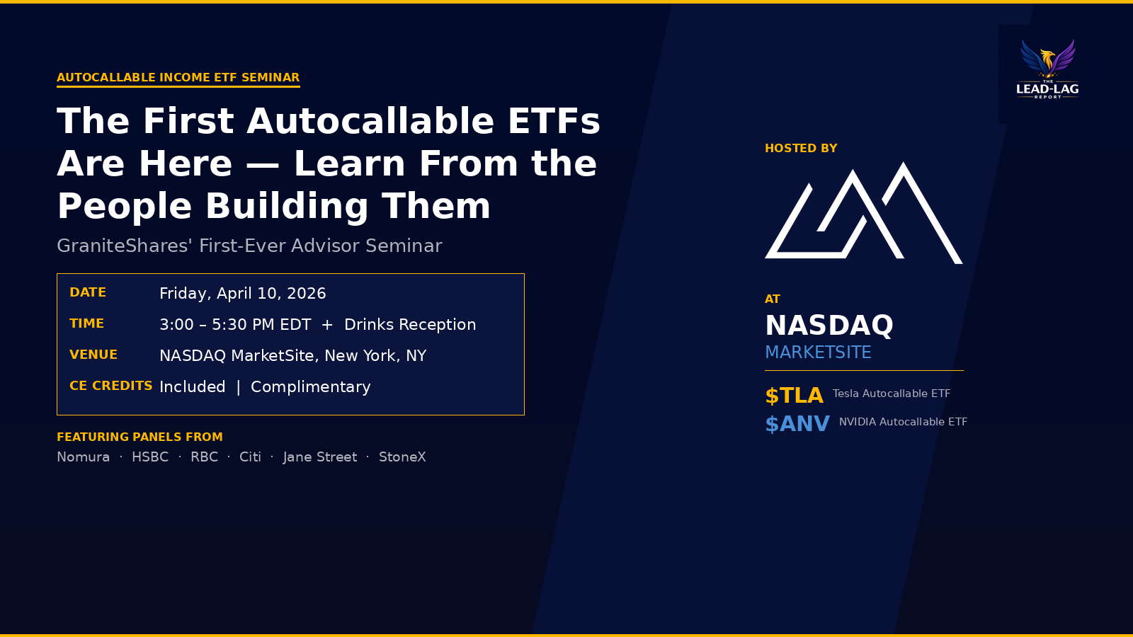 GraniteShares is hosting its first-ever Autocallable Income ETF Seminar on Friday, April 10th at the NASDAQ MarketSite in New York City — and if you’re an advisor trying to understand how autocallable strategies are being democratized through the ETF wrapper, this is the event to attend.