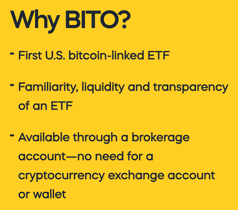 BITO is an actively-managed ETF. It aims to produce returns that correspond to bitcoin, but are unlikely to directly correlate. It typically invests in front month bitcoin futures contracts with an expiration of one month or less. BITO does not invest directly in bitcoin.