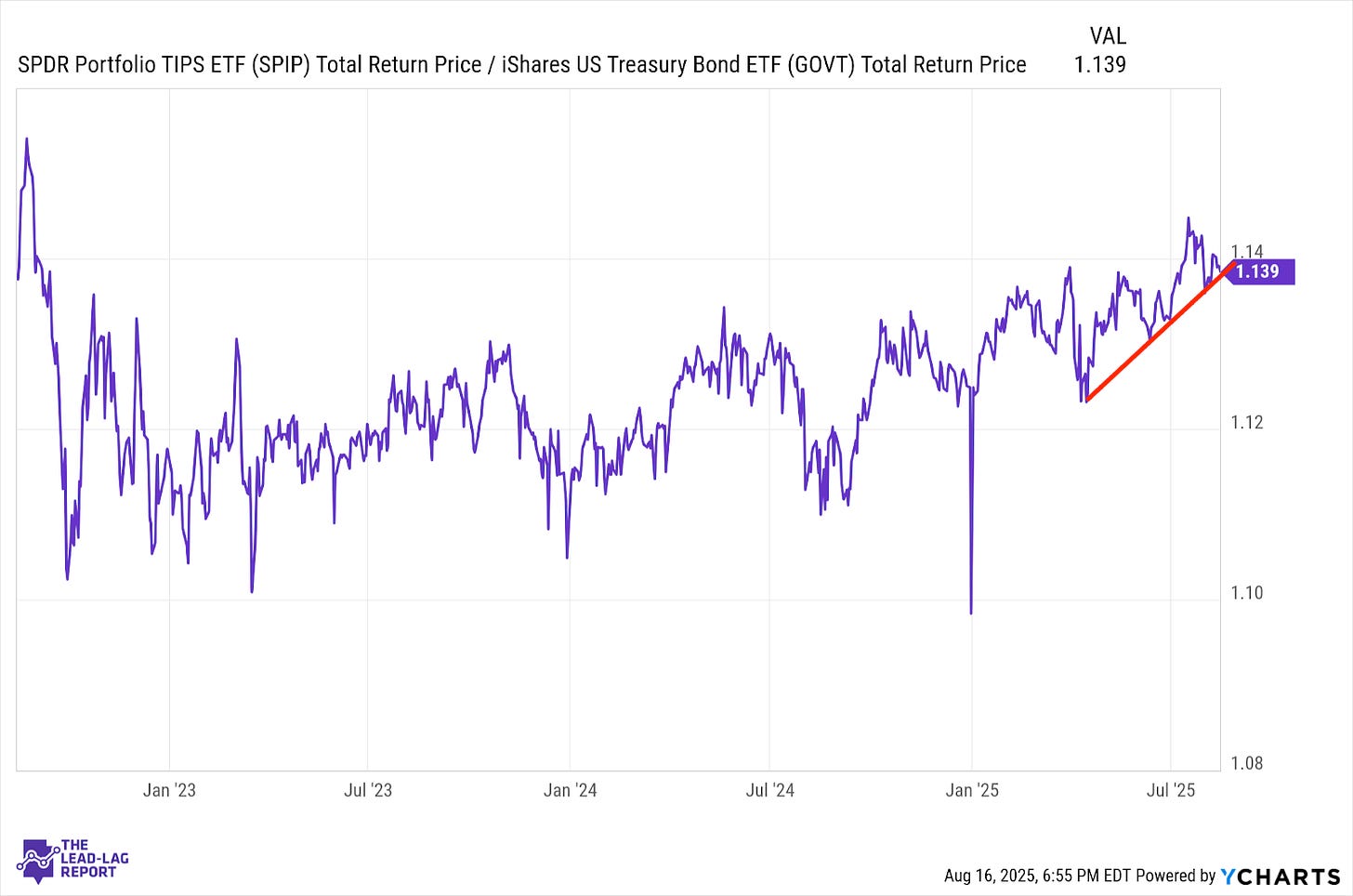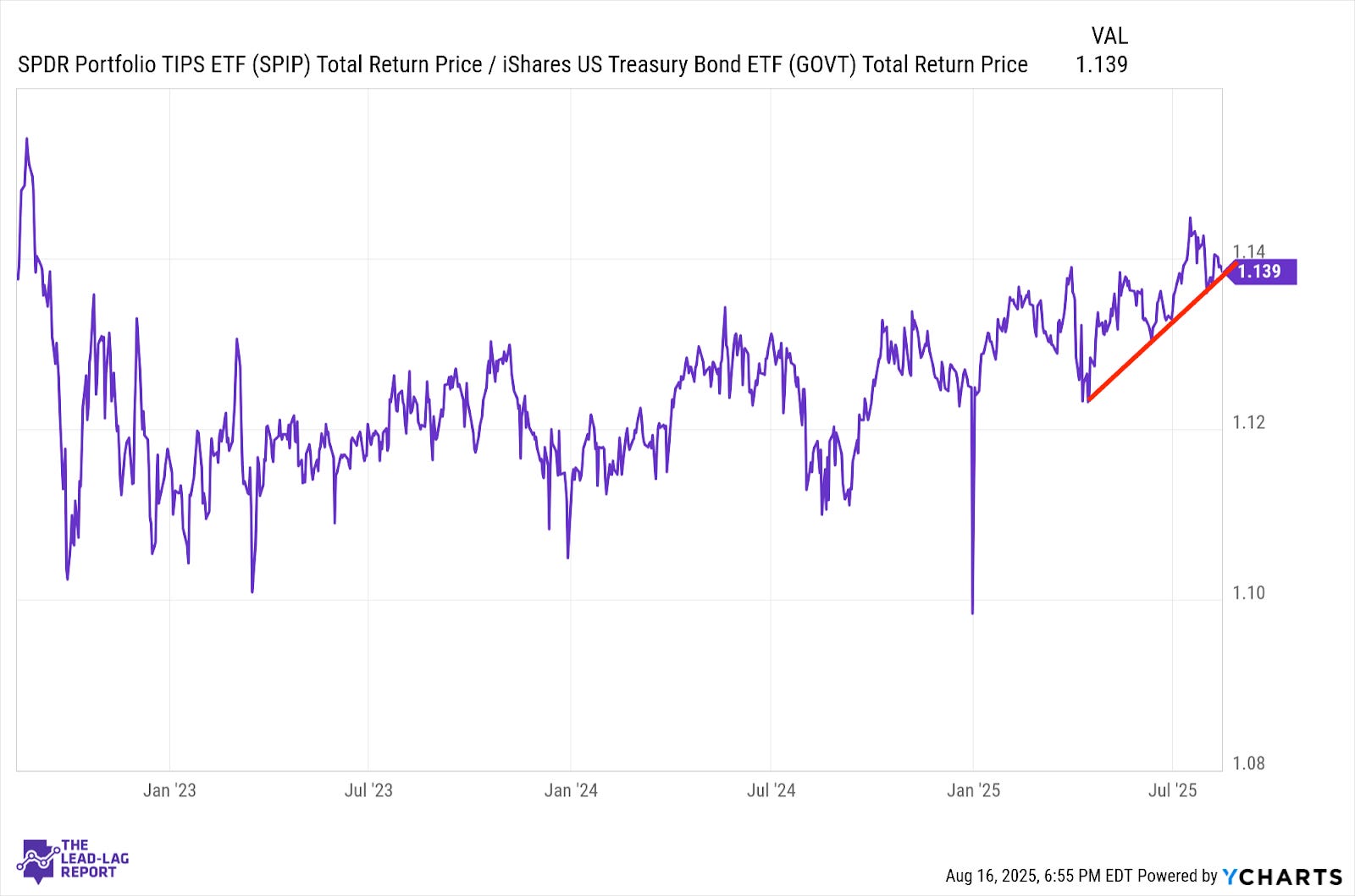 Inflation-protected securities have underperformed nominal Treasuries as market-based inflation expectations have moderated from their earlier peaks. Recent CPI and PCE reports have shown progress in services inflation, contributing to the narrative that the Fed's restrictive policy stance is having the desired effect. The spread between TIPS yields and conventional Treasuries suggests the market expects inflation to continue normalizing toward the Fed's target over the medium term.