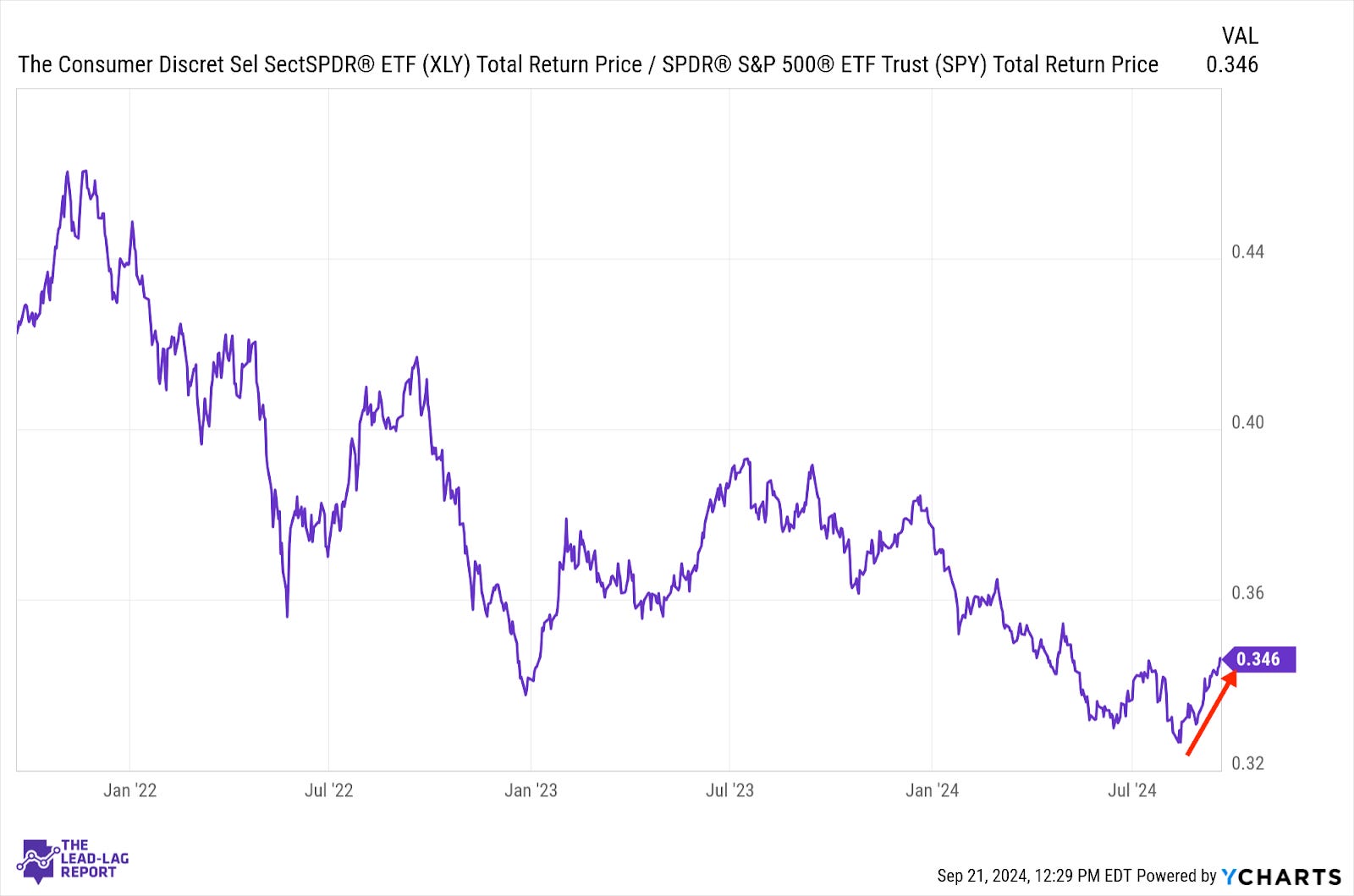 The combination of durable retail sales and spending numbers with lower interest rates are driving a solid rebound in discretionary stocks. While I’m not necessarily a big believer in the strength of retail, there has been enough relatively positive data in the past several weeks that I wouldn’t be surprised if this sector was able to extend its outperformance a little longer.