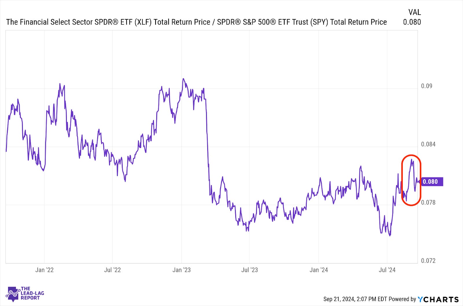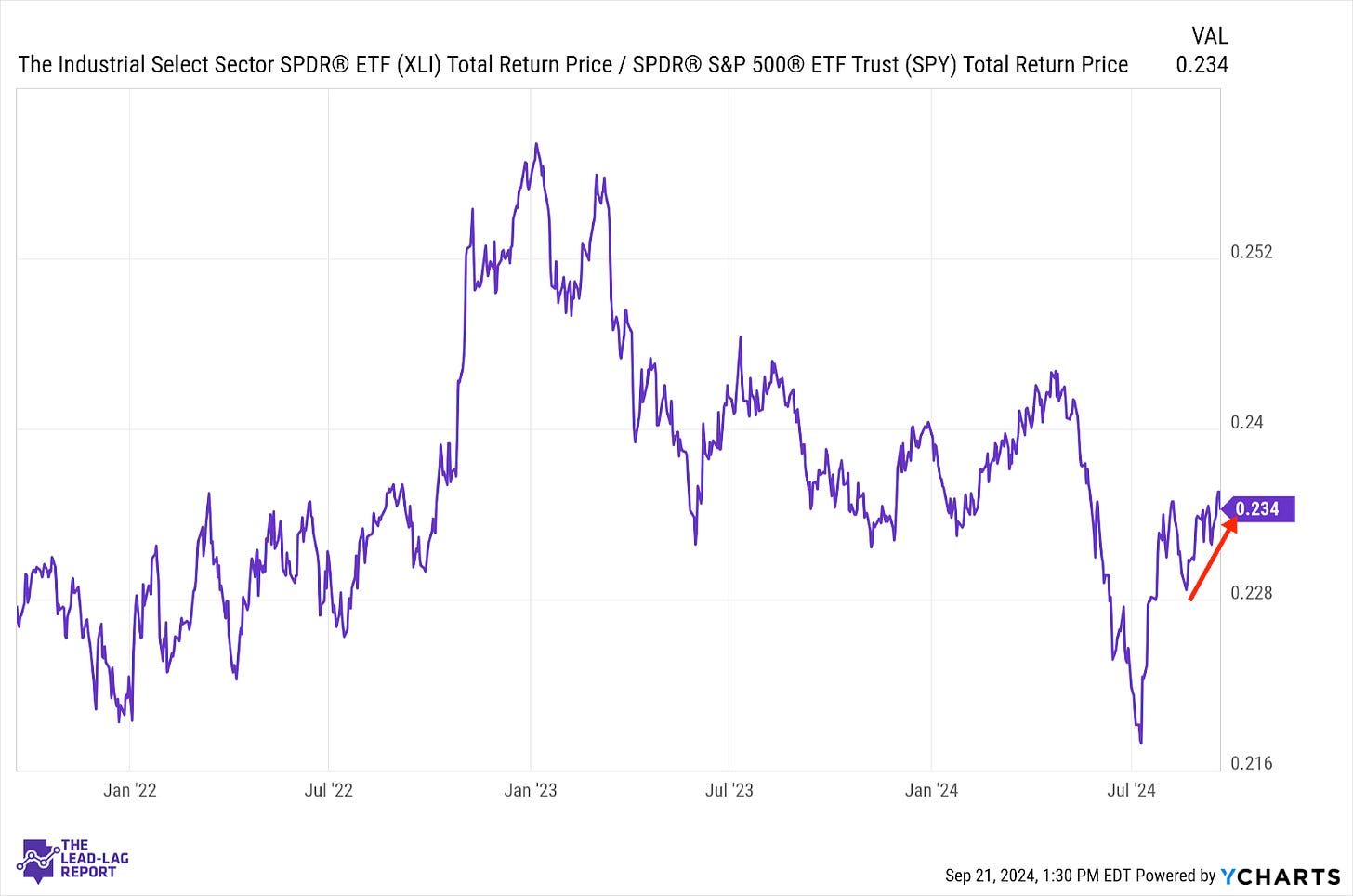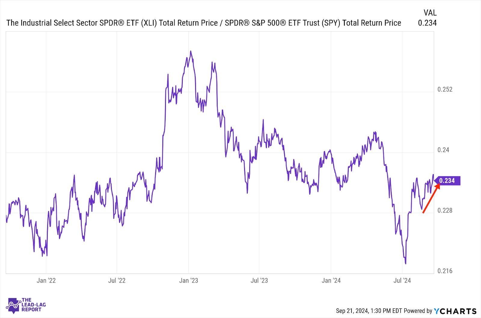 After a choppy period of sideways movement, cyclicals got a nice jolt from the Fed’s rate cut last week. As we saw a couple months ago, the idea of easing monetary conditions has benefited cyclical sectors the most. Industrials may not necessarily end up as the best-performing group of the bunch (materials and energy may do some catching up in the meantime), there’s a good case that this uptrend could keep moving higher.