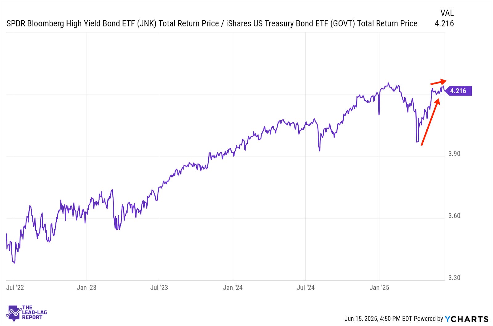 Junk bonds seem to be running into a ceiling in its performance relative to Treasuries. Outperformance has begun to level off a bit, although lower-rated bonds still seem firmly in favor for bond traders. With inflation contained and growth appearing to rebound, investors are back to showing little concern for credit risk, as they did prior to 2025.