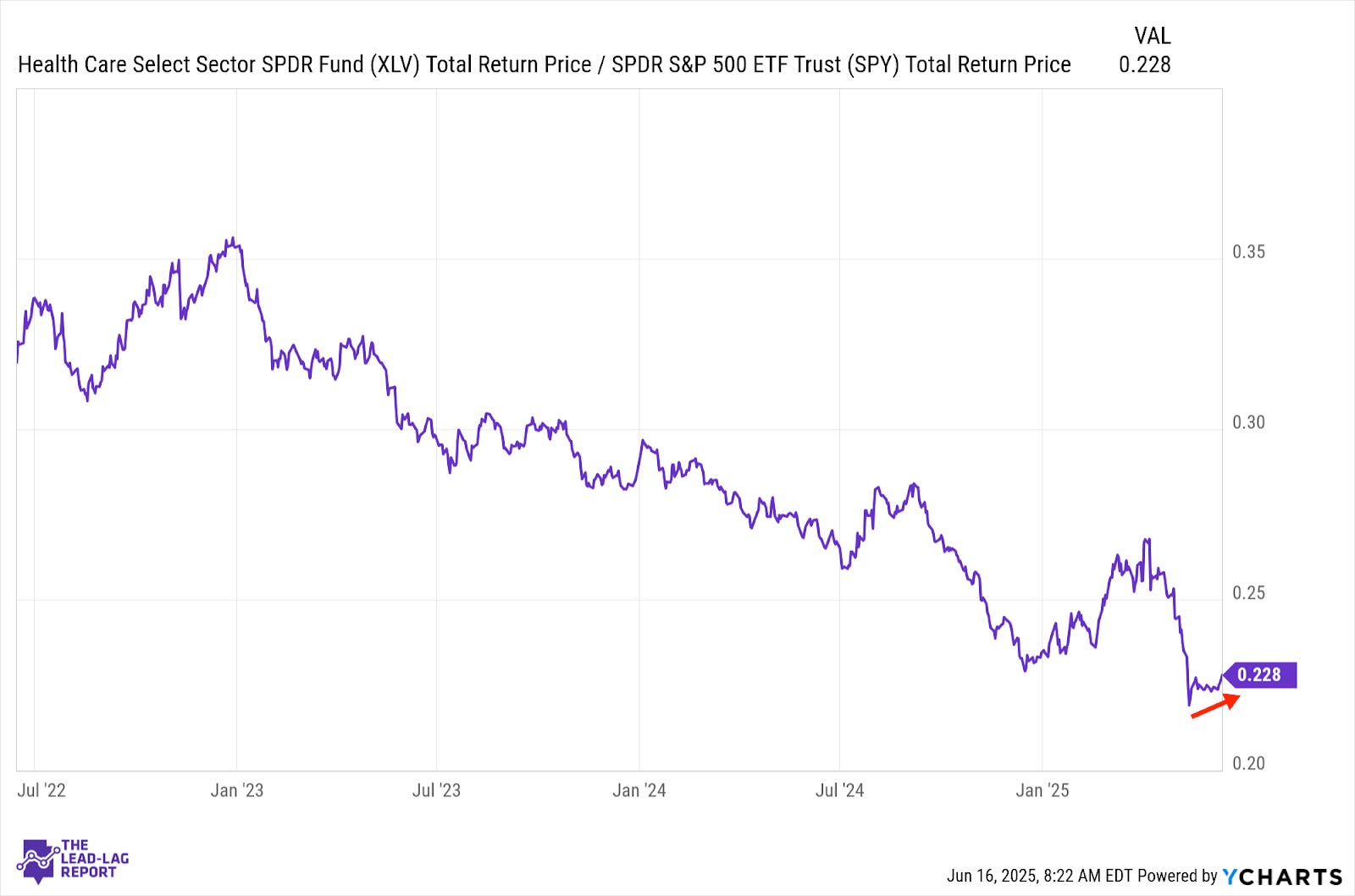 Look closely and you’ll see that healthcare is actually doing fairly well despite the backdrop of tech & growth stock outperformance. Granted, it’s a very shallow uptrend, but seeing as how stretches of outperformance have been few and hard to find over the past 2+ years, it’s an interesting development. This sector tends to be a consistent outperformer during down markets, so this ratio becomes one worth watching closely.