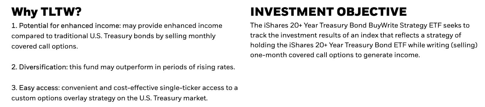 TLTW seeks to track the investment results of an index that reflects a strategy of holding the iShares 20+ Year Treasury Bond ETF while writing (selling) one-month covered call options to generate income. The index aims to use options that are approximately 2% out-of-the-money, limiting income potential somewhat but providing the opportunity for some capital growth along the way.