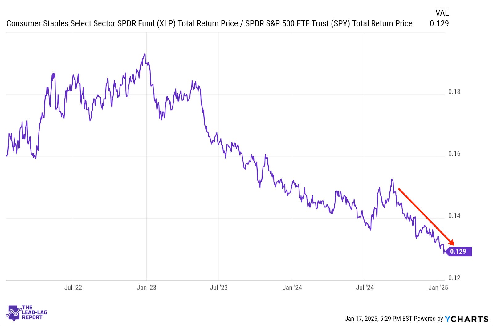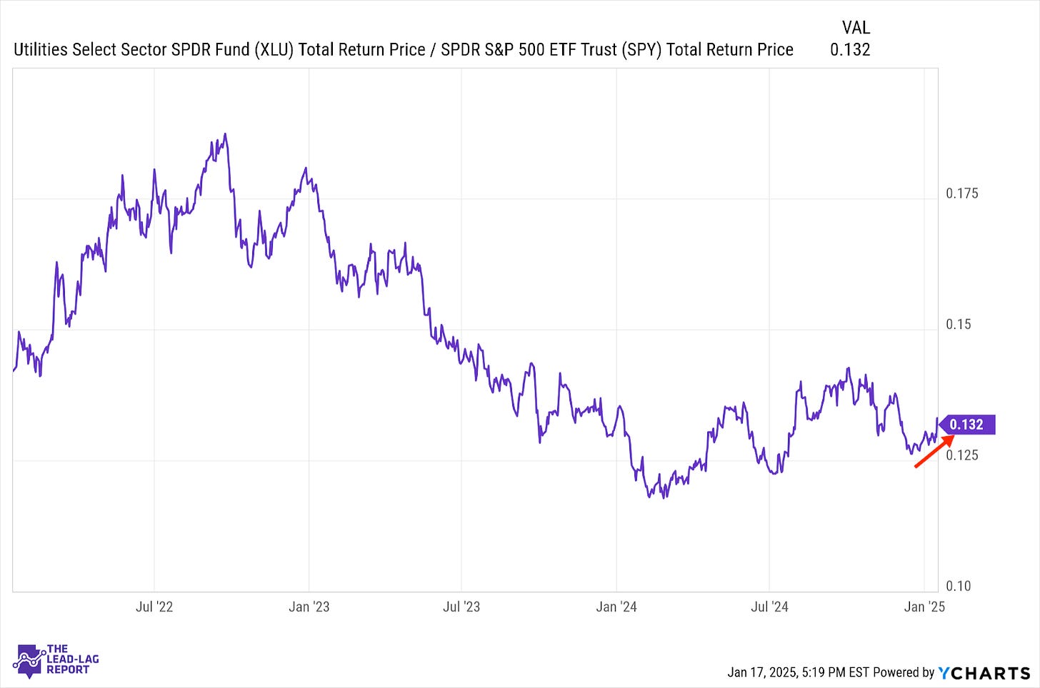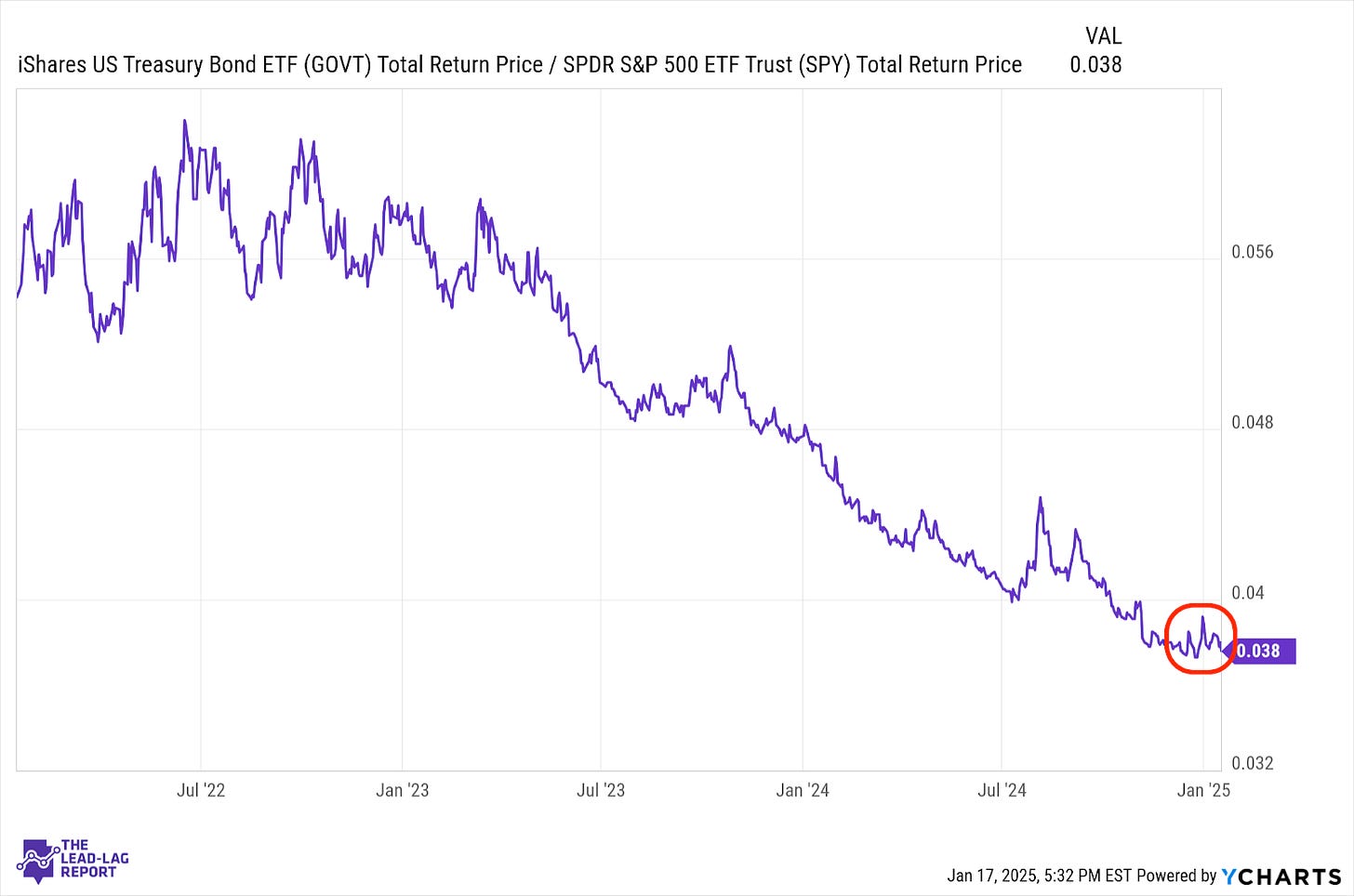 Long bonds continue to lag as inflation (even post-CPI report) is a threat and the Fed is unlikely to cut much over the next 12 months. As mentioned above, the bond market is demonstrating little concern about current credit risks, although they continue to be on the rise. This feels like a situation where once the market gets spooked and investors finally realize that the signs have been there for a while, this ratio shoots higher and quickly.