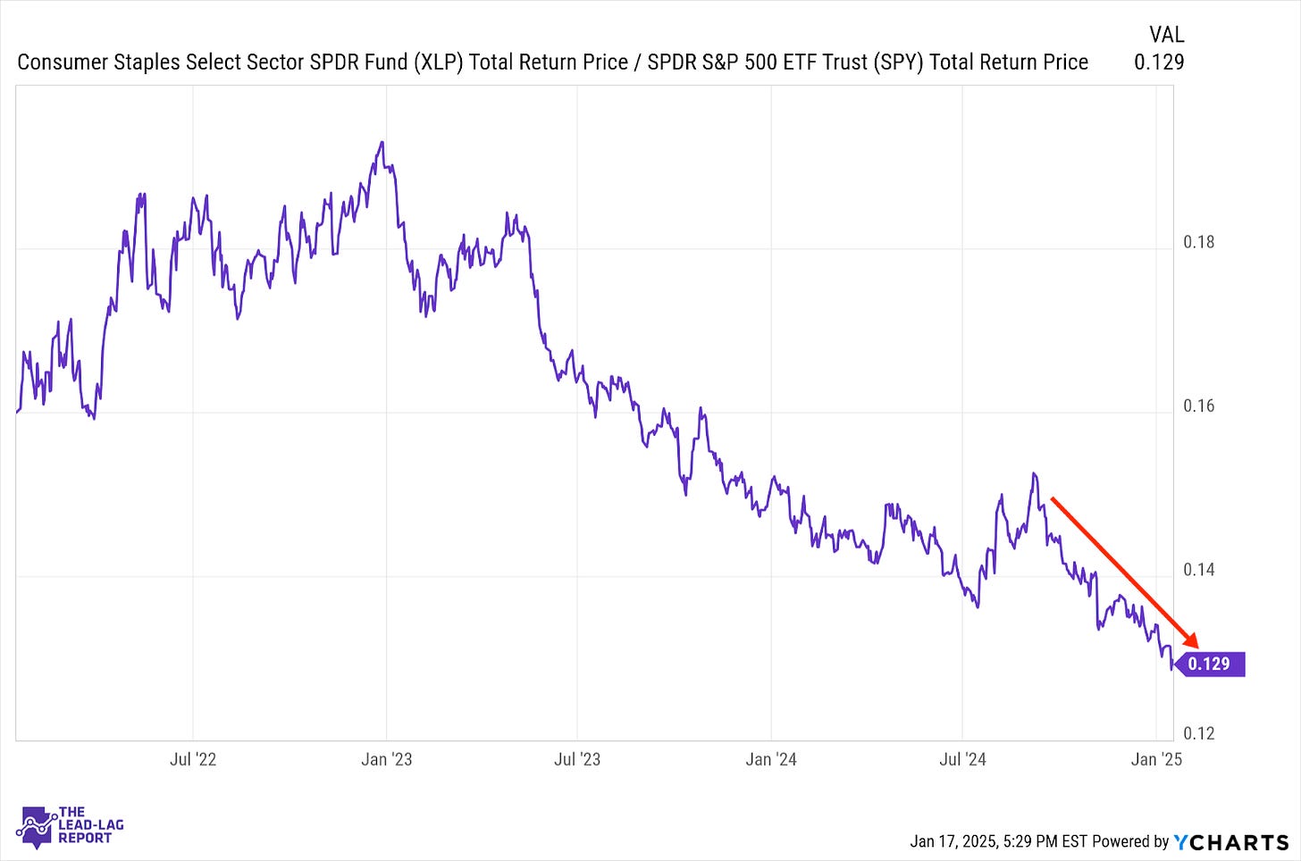 Banks got a big boost from (at least temporarily) lower interest rates. This sector has actually done an admirable job of steadily outperforming the S&P 500 since the regional banking crisis low. Still, the persistence of inflation and higher interest rates will be a headwind from here. Big banks are surviving thanks to a rebound in investment banking and trading revenue, but the bread & butter of this business - lending - remains in doubt.