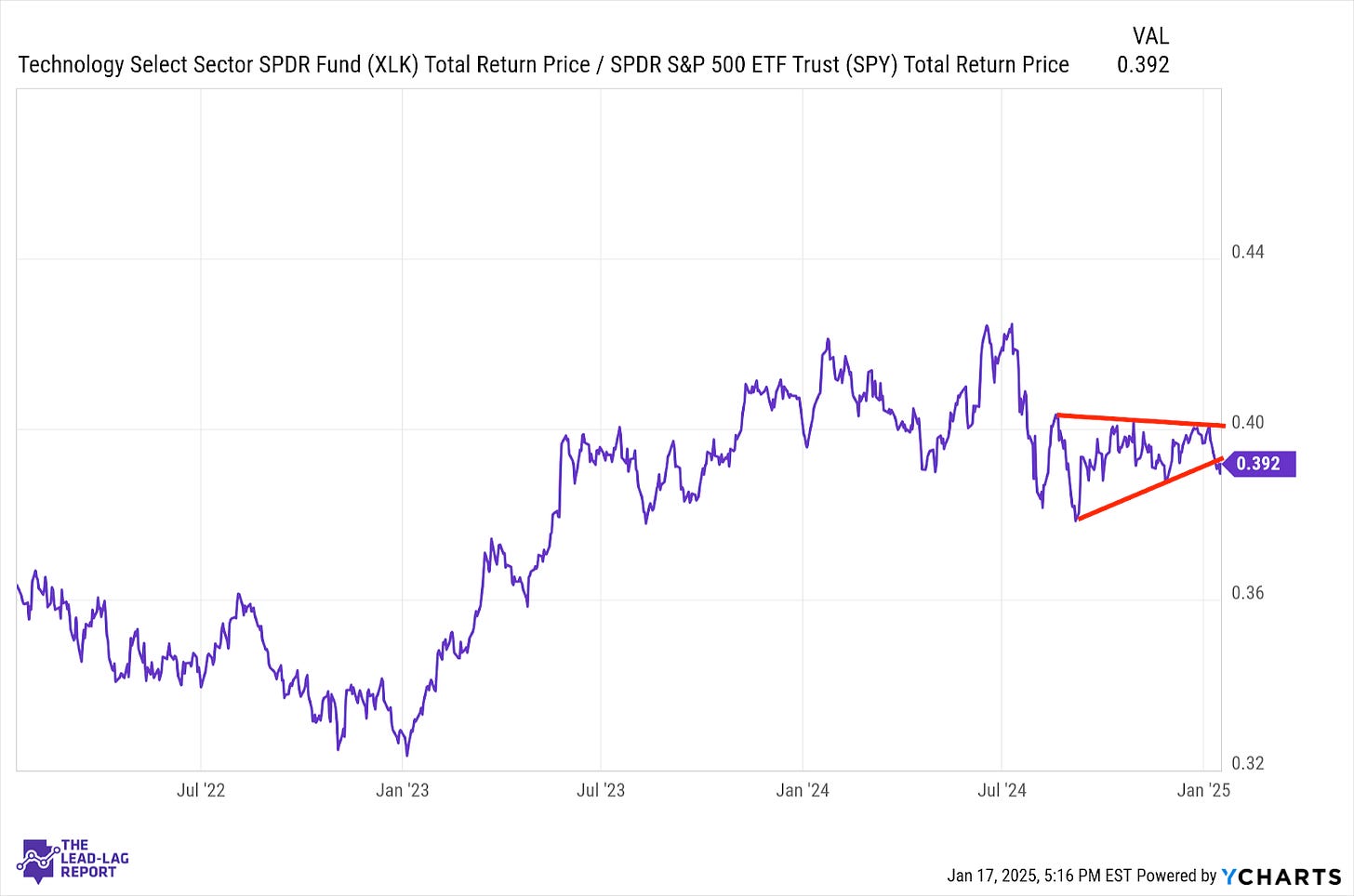 Tech has started slipping again and is struggling to pick up momentum again, even when the economy gets favorable inflation data. In the past several weeks, the market rotation has been between defensives and cyclicals. Growth has been getting somewhat left behind. The chart is looking like there might be a potential breakdown here, but the tech outlook could depend heavily on Trump policies over the next few months.