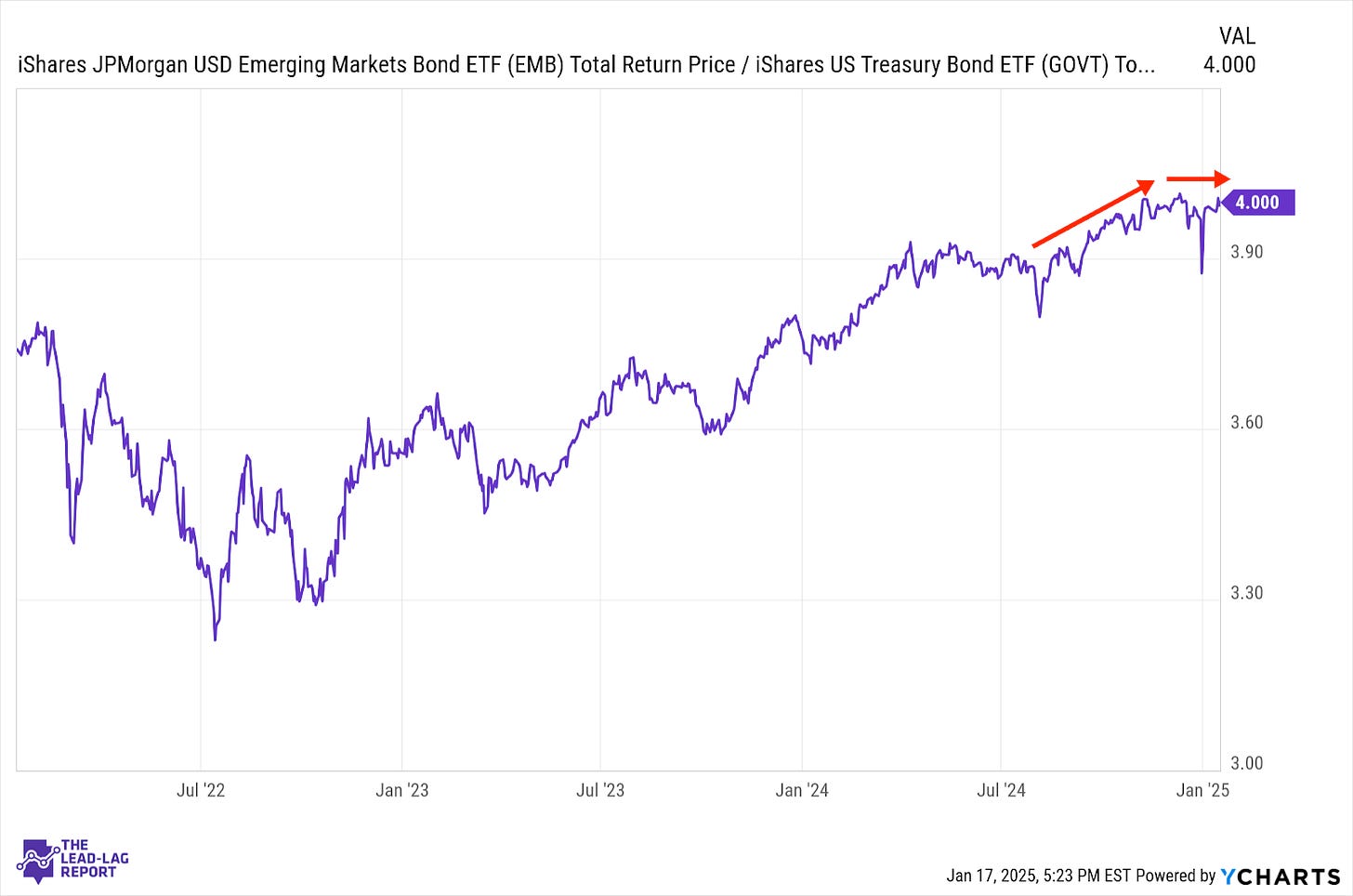 It looks like emerging markets are still in the process of topping out after years of outperforming Treasuries. Spreads, as mentioned under U.S. junk bonds, still remain surprisingly narrow and that could potentially keep EM debt looking good for a while longer. Still, I really don’t like the downside risk of any low-grade debt given how investors seem to be pricing in little, if any, credit risk right now.