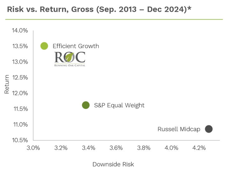 Since inception, Efficient Growth has provided 26% more return than the S&P 500 Equal Weight Index and 69% more return than the Russell Mid Cap Index, given the same level of downside risk, gross of fees. (Ulcer Performance Index) 1