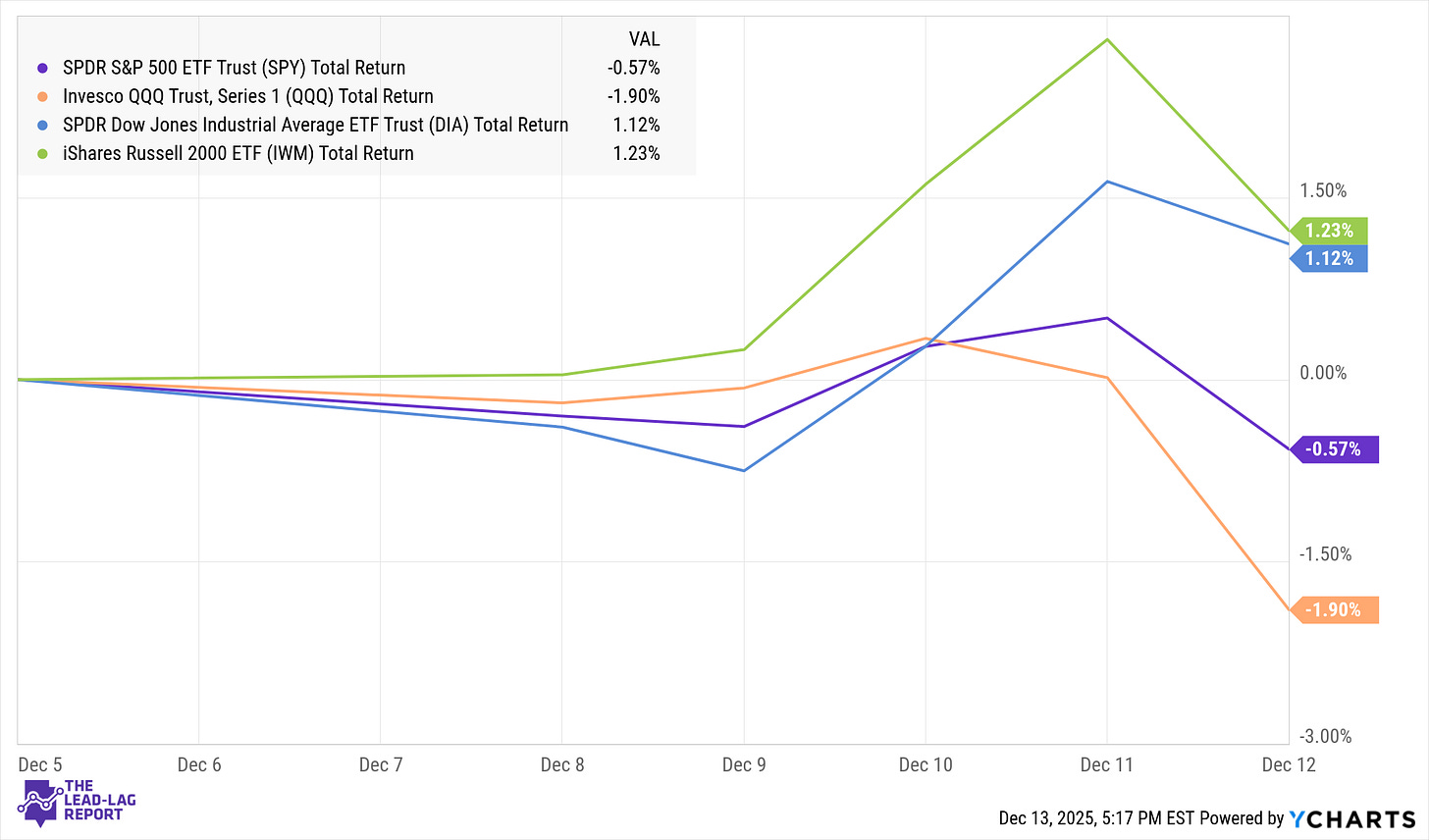 U.S. equities pulled back during the week ended December 12, with weakness concentrated in large-cap technology even as the Dow and small caps posted gains.