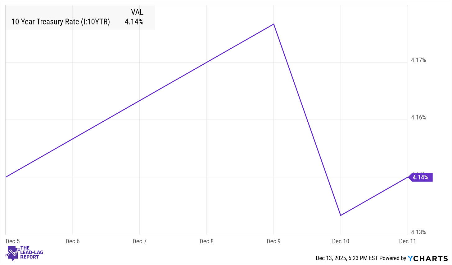 U.S. equities pulled back during the week ended December 12 as investors reassessed risk heading into the Federal Reserve’s final policy meeting of the year. After flirting with record highs earlier in the month, markets lost momentum amid renewed concerns around inflation persistence, stretched technology valuations, and uncertainty over the Fed’s path into 2026. For the week, the S&P 500 declined roughly 0.6 percent, while the Nasdaq Composite fell about 1.6 percent, weighed down by weakness in large-cap technology and AI-linked names.¹ In contrast, the Dow Jones Industrial Average gained over 1 percent, reflecting rotation toward more defensive and value-oriented components of the index. The tone shifted from cautious optimism to selective risk reduction, with investors less willing to chase year-end upside without clearer policy guidance.