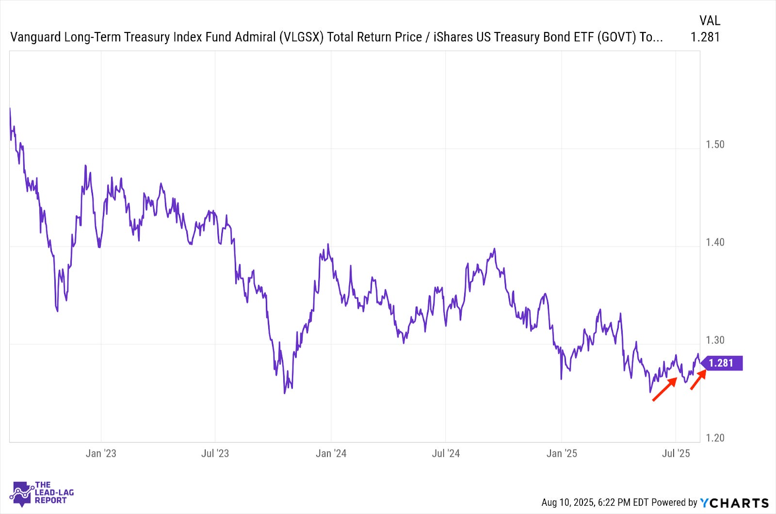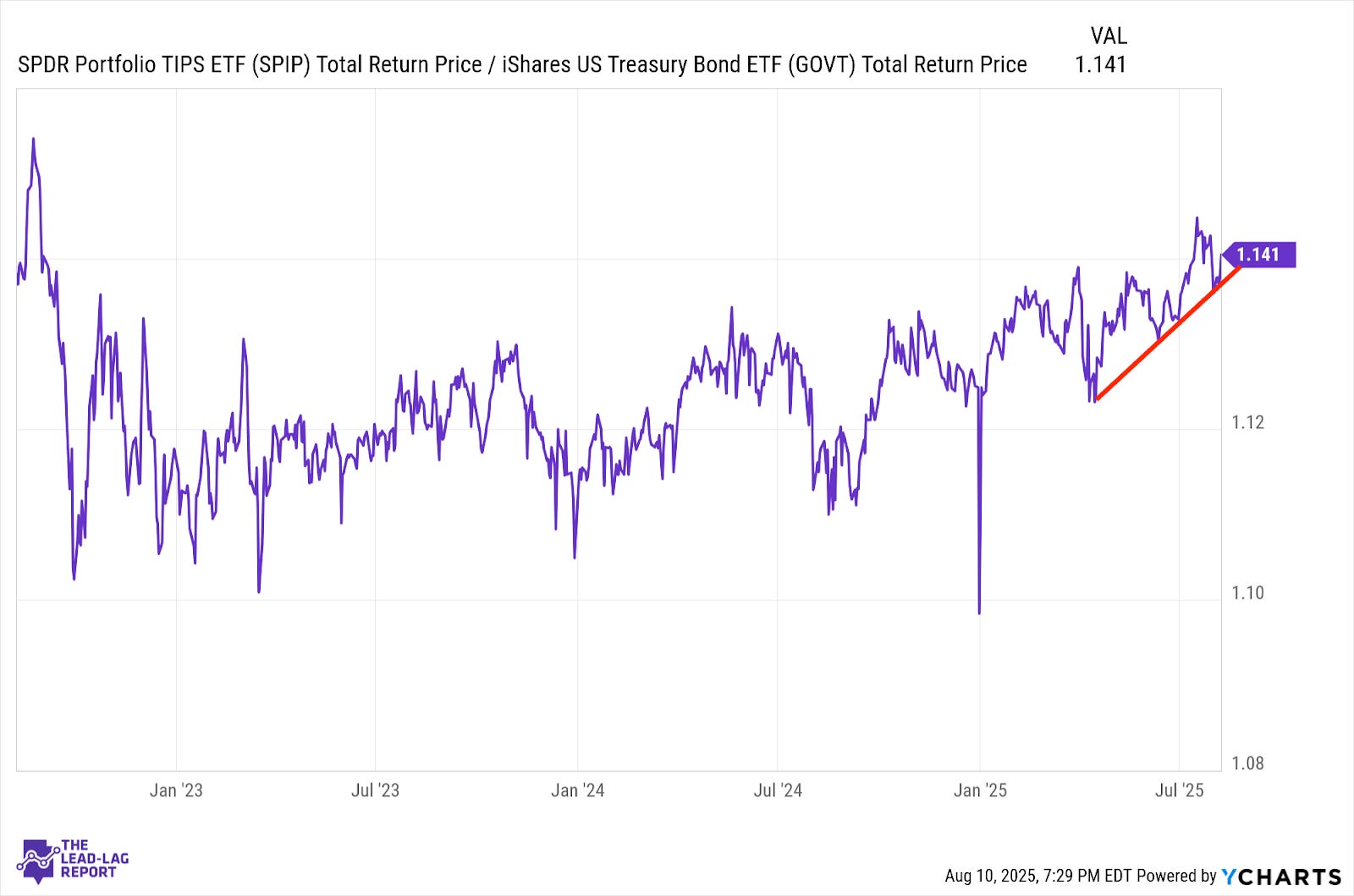 Look closely and you can see something of an uptrend forming in inflation protection. It comes at an interesting time too because this week we’ll get another round of CPI data, which is going to be watched very closely following the big jump in the June rate. Given the trend of this ratio, it appears that investors are at least a little worried that inflation might be getting away from the Fed here.