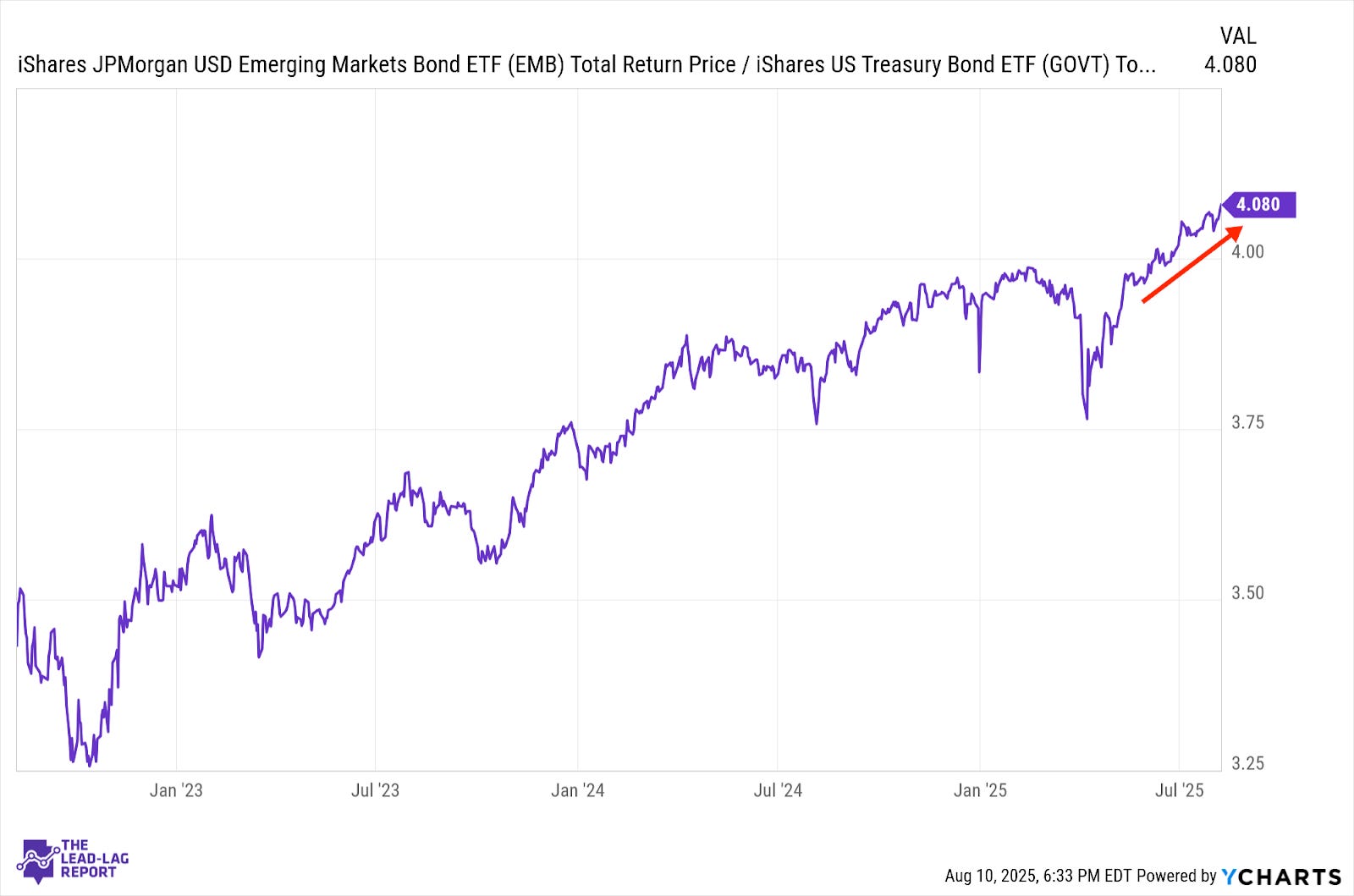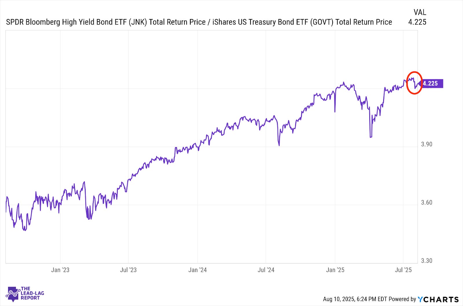 This ratio is reflective of the theme over the past two weeks - labor market fear followed by a risk-on return. As of this moment, the drop in this ratio is looking like it could be another head fake. If the market is looking at 2-3 rate cuts yet in 2025 and we get a liquidity tailwind from the Trump tax cut bill, there’s pretty clearly an environment developing that could be conducive to low-rated debt.
