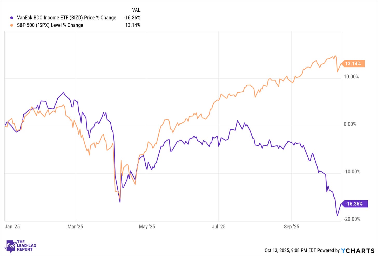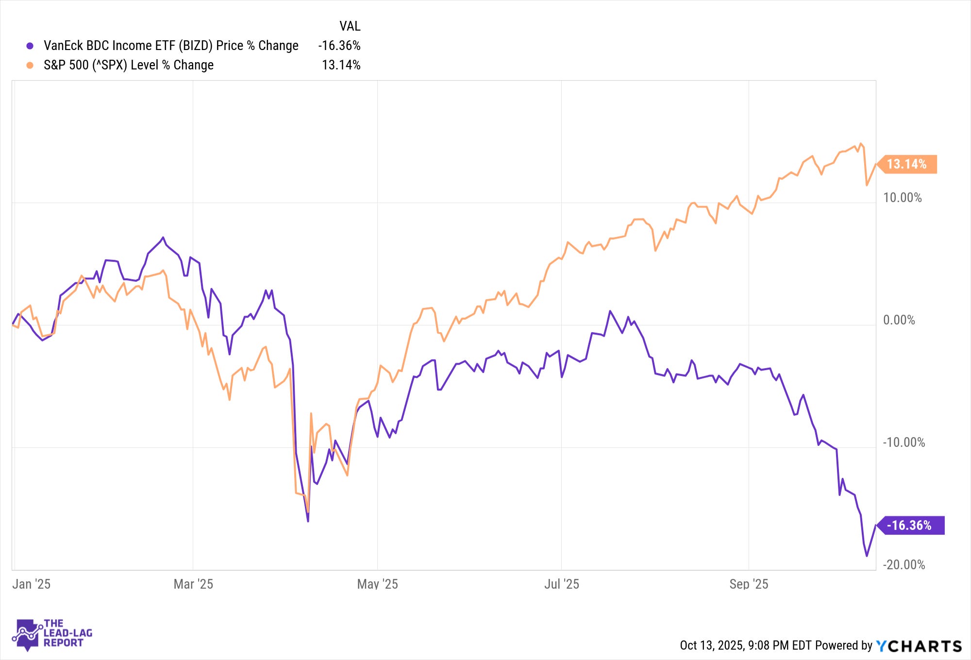 The Business Development Company (BDC) sector has had a rough ride in 2025. The VanEck BDC Income ETF (BIZD), a broad proxy for the group, is down 16.36% year-to-date as of early October, while the S&P 500 is up over 13%.¹ Even reliable names like Ares Capital (ARCC), Blue Owl Capital (OBDC), and Blackstone Secured Lending (BXSL) are trading 10–20% below their 2024 highs.² Despite attractive yields — often in the 9–11% range — the market is pricing in deeper credit risk and the possibility of further dividend cuts.