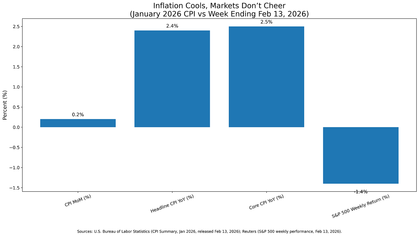 The week closed with what should have been constructive macro news. January’s Consumer Price Index rose 0.2% on a seasonally adjusted basis. Headline inflation decelerated to 2.4% year over year, while core stood at 2.5%.¹ In isolation, that combination supports the “soft landing plus eventual easing” framework that has underpinned much of the market’s optimism.