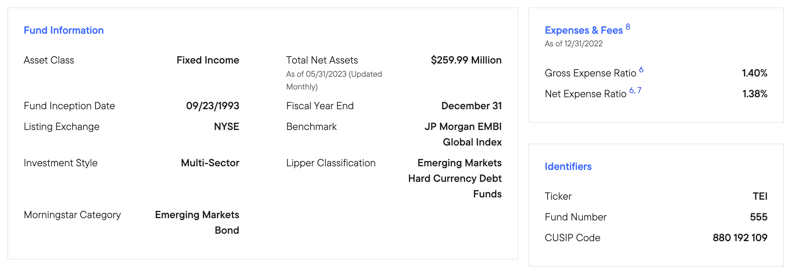 TEI seeks high current income, with a secondary goal of capital appreciation, by investing primarily in the income-producing securities of sovereign or sovereign-related entities and private sector companies in emerging market countries. These securities will mostly be issued in local currencies, which means fluctuations in the dollar relative to these currencies will add to or detract from returns. The fund also utilizes a modest degree of leverage in order to enhance yield and total return potential.