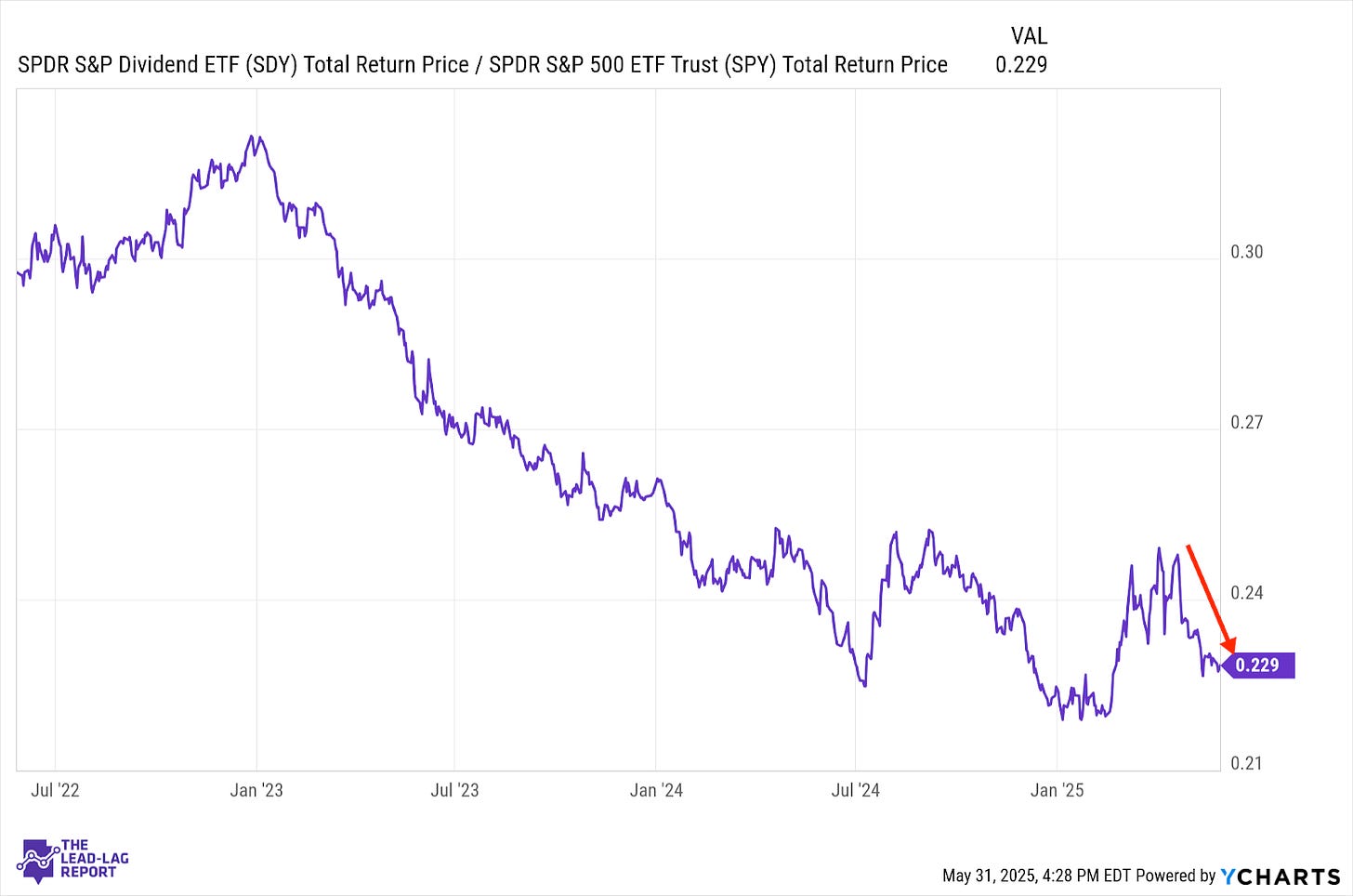 Dividend stocks have been consistently struggling to maintain any sense of outperformance and have been giving back short-term gains. This ratio seems to do a fairly good job of reflecting the start & stop nature of both forward economic expectations, the direction of the Fed and trade war developments. The lack of clarity has meant a lot of ups and downs with not much steady progress.
