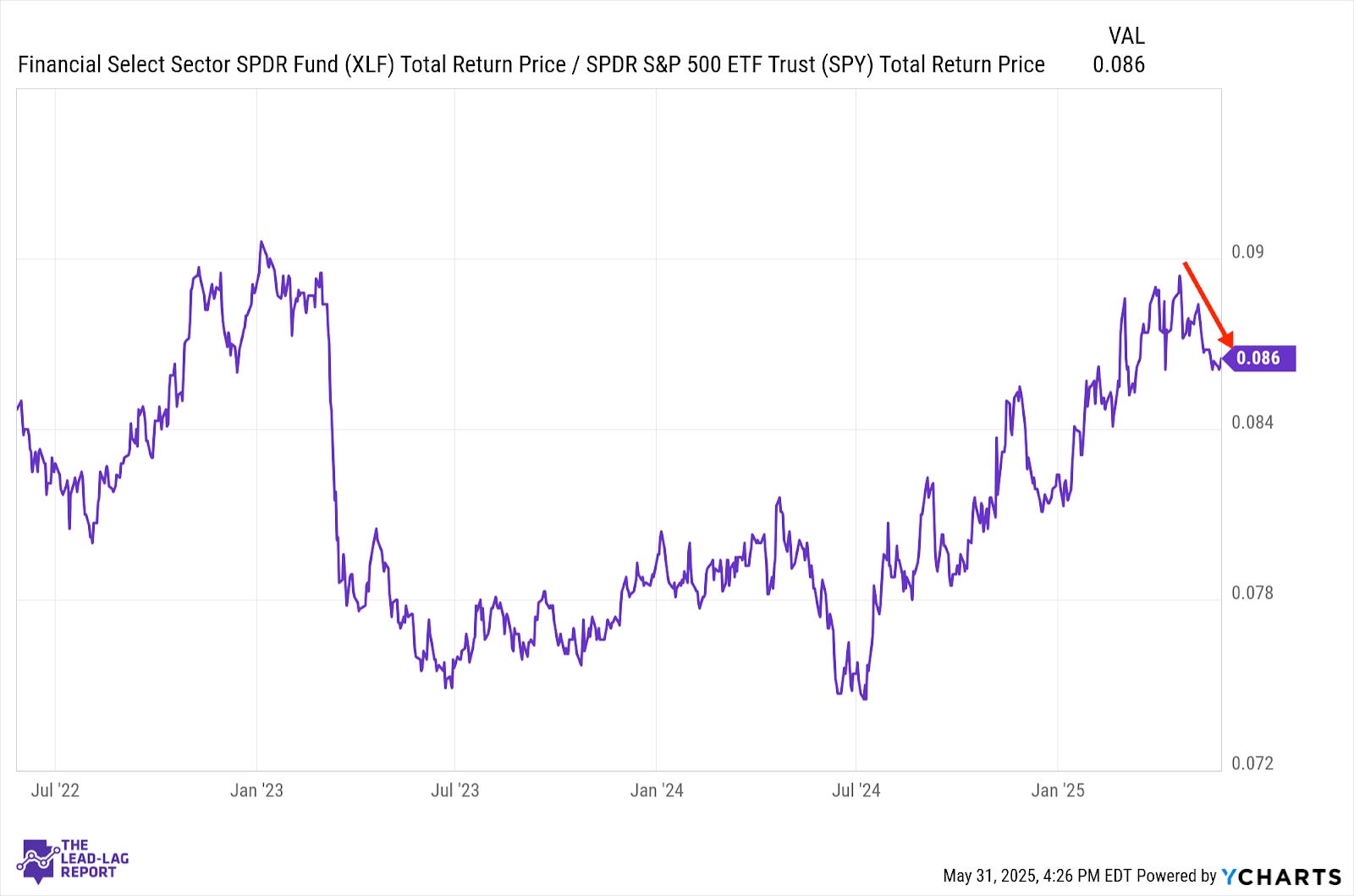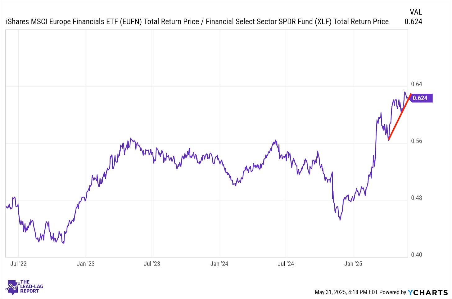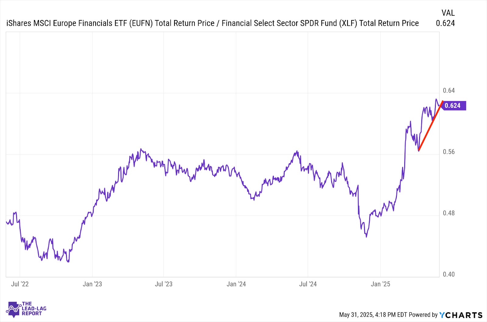 For as well as U.S. financials have done this year, especially relative to the S&P 500, European financials have done even better. If the U.S. economy stages a reasonable comeback in Q2, which is looking more likely than not, and the trade war can remain somewhat subdued, there’s a possibility that a near-term peak in this ratio might be in order. Still, the economic outlook for the Eurozone is looking marginally better and could continue to help.