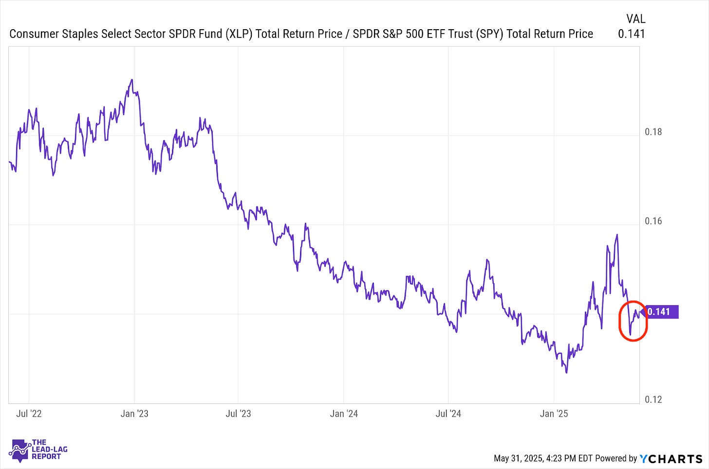 Staples have struggled to gain any consistent momentum for about 2½ years as every rally has been met with lower lows. The bounce over the past couple of weeks has been encouraging and there’s definitely enough uncertainty to warrant a broader shift to defense by investors. On the other hand, if the market realizes that the Trump tariff volatility is little more than posturing (and the lack of a move in the VIX last week suggests it does), staples might struggle to run here.