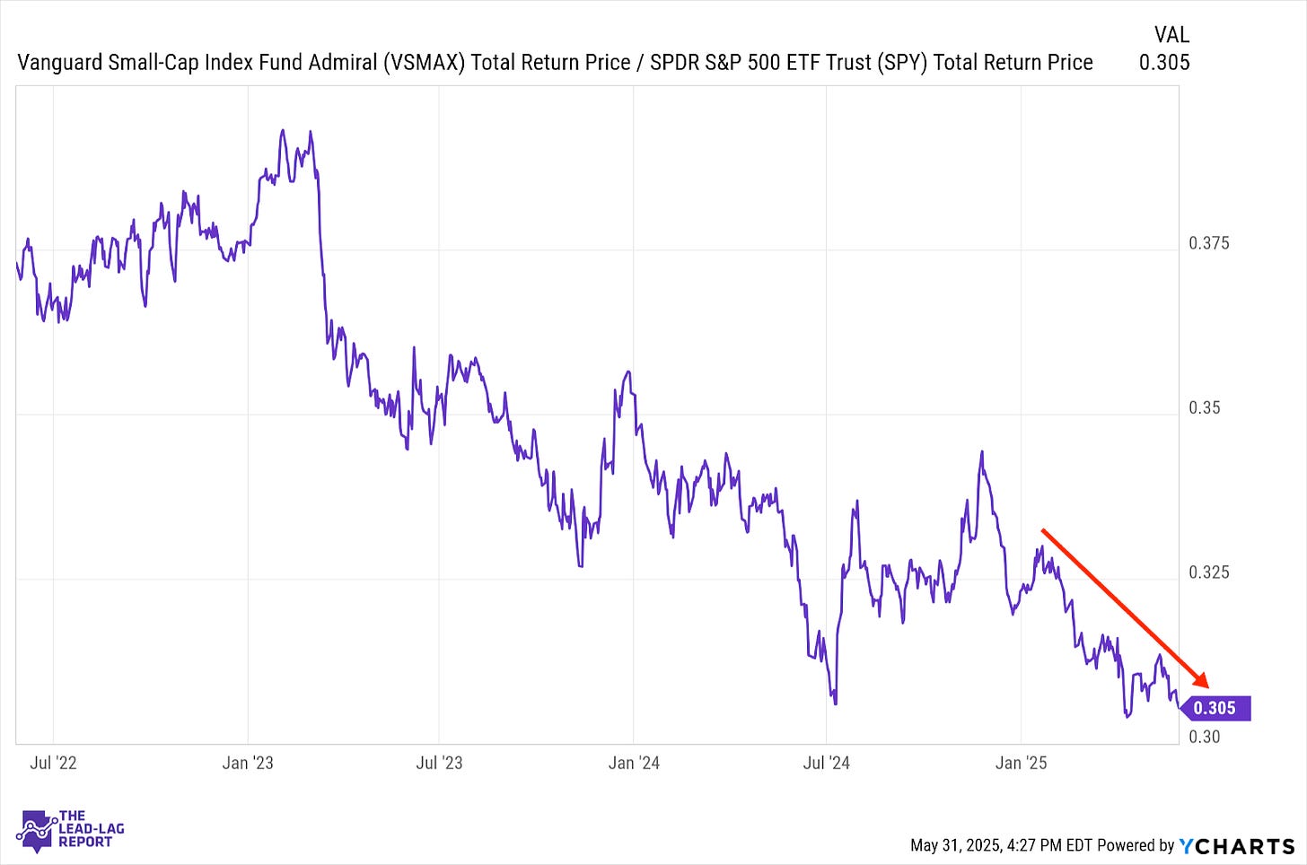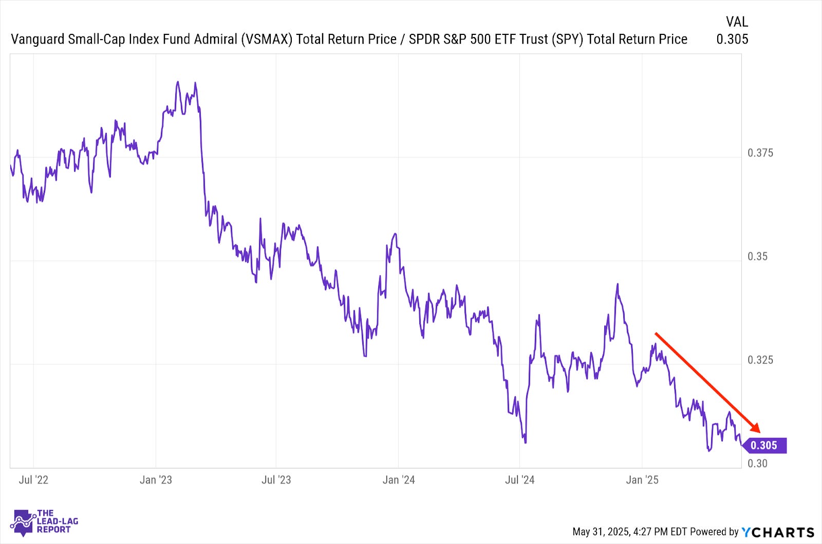With so much struggle to push through tariffs and other economic policies, I think deregulation may become the ultimate calling card that finally works. If that happens, it could be the catalyst that finally shifts small-caps into gear. The fact that U.S. stocks are re-approaching highs, yet this ratio is still moving lower, means there’s some fundamental disconnect that suggests much of the economy is still in trouble.