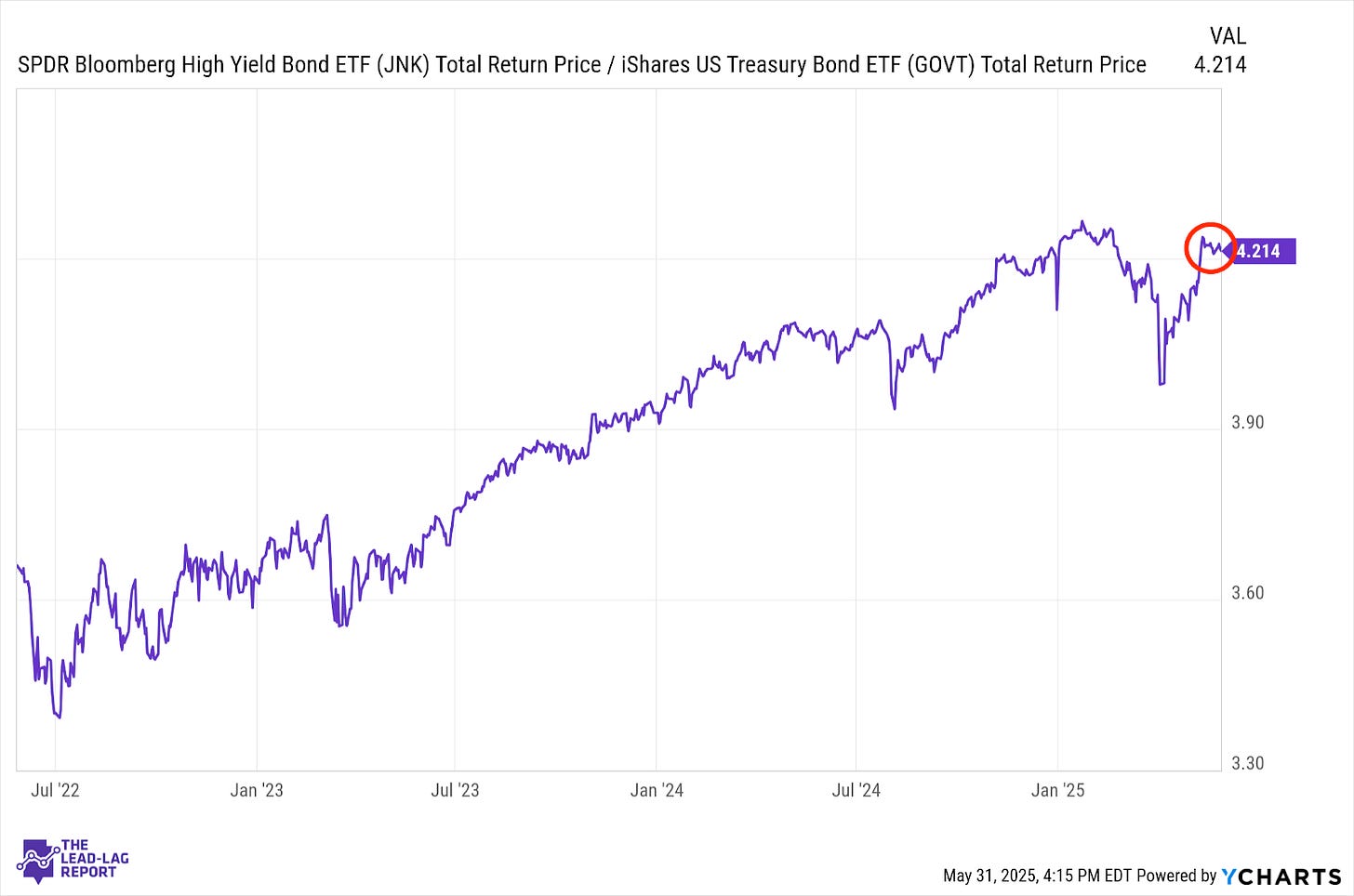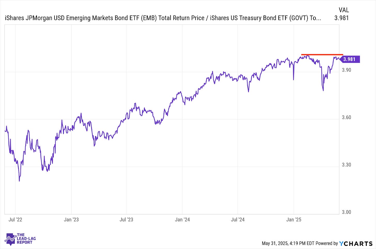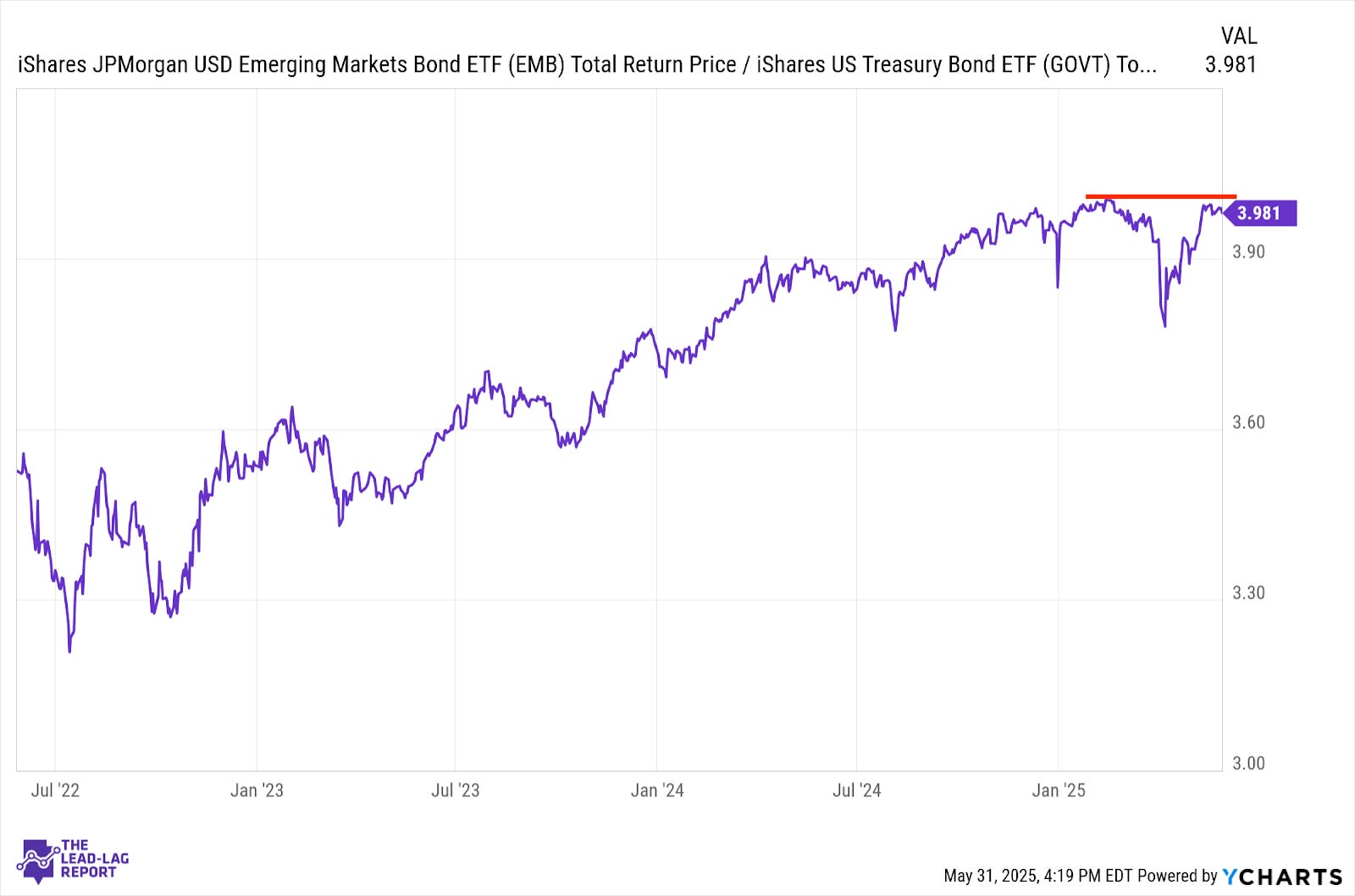 Emerging markets debt has two things going for it - the general preference of bond investors to push lower down the credit quality ladder to reach for yield and a falling dollar that’s at its lowest level since 2022. This ratio is approaching its peak from earlier this year, but it looks like it’s running into a little short-term resistance. Overall, I think the outlook for this group is still looking favorable.